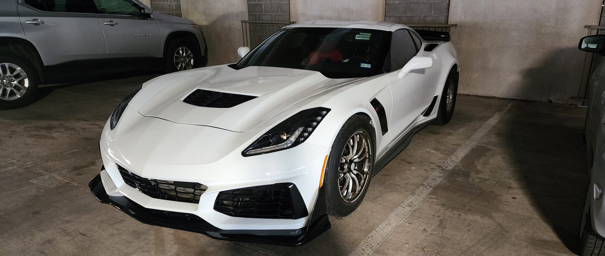 1200whp 2015 Chevrolet Corvette Z06 1LZ in Arctic White with 21,128 (Chassis) miles for sale! This Houston Performance Solutions built C7Z sources power from a built engine that was professionally assembled by Modern Airflow Dynamics. The engine build utilizes a new LT4 block from GM as its base with Callies rods, Diamond pistons, and TSP heads with a Ferrea valvetrain. A ProCharger F-1A-94 supercharger kit force-feeds loads of boost into the ProCharger billet intake manifold on top. Mated to built LT4 is a Tremec TR-6070 7-speed manual transmission that’s paired with an upgraded Monster clutch, followed by a MGW shifter. This setup also makes use of a Nitrous kit with a Lingenfelter timing control box/heated aluminum bracket. The fuel system consists of a Crawford all in one port injection kit with a Fore Innovations triple pump fuel system. Additional key components include TSP 2” headers with an x-pipe, Corsa exhaust, upgraded radiator, Carlyle Racing 15” conversion, Weld Racing Vitesse wheels, LG coilovers, and more. Tuning was handled by Jeremy Capps with an output of 890whp @ 15Ibs of boost, and 1200whp on a 200 shot of nitrous. Only 2K miles on the build! Receipts are available! Clean title!