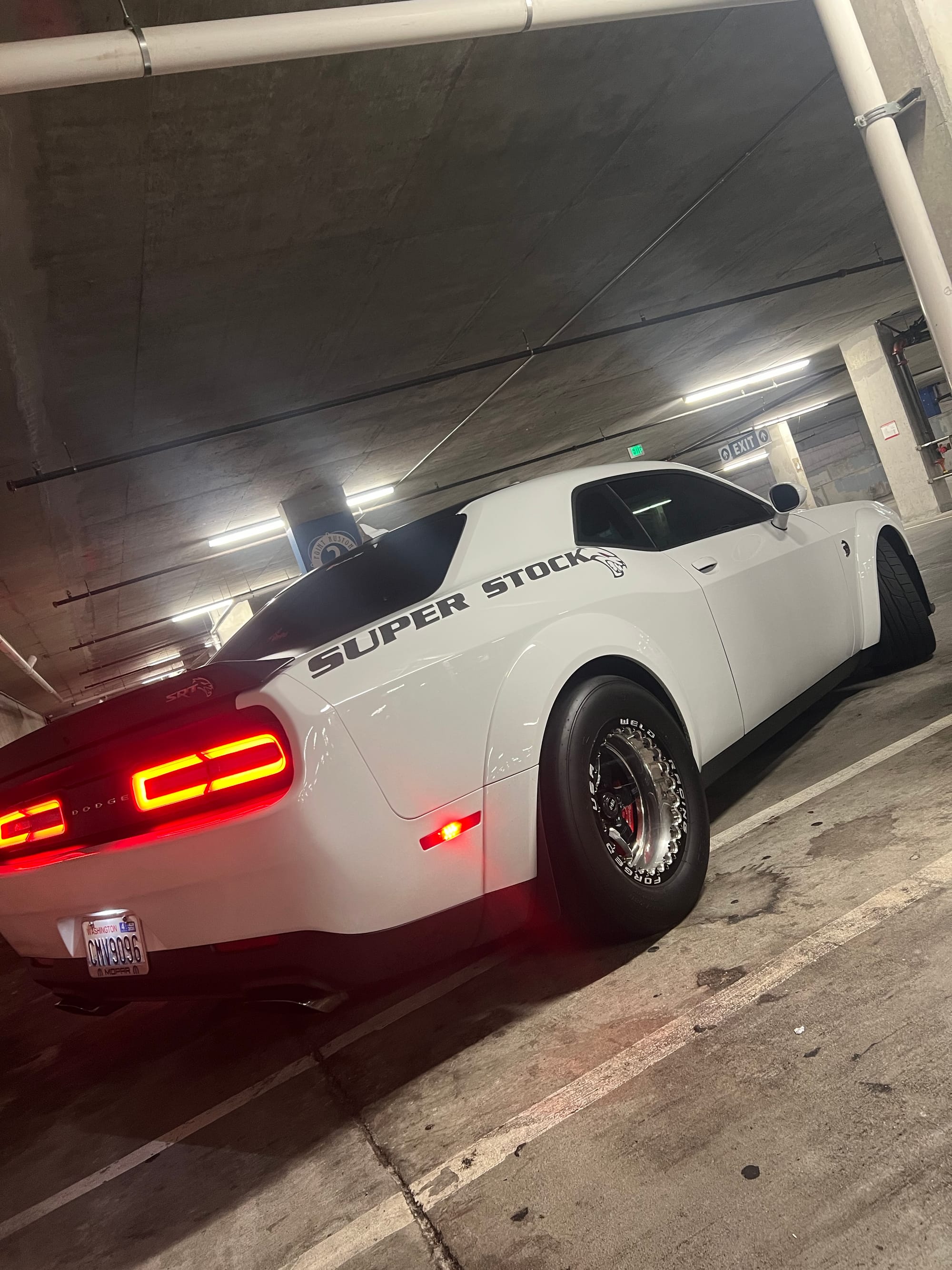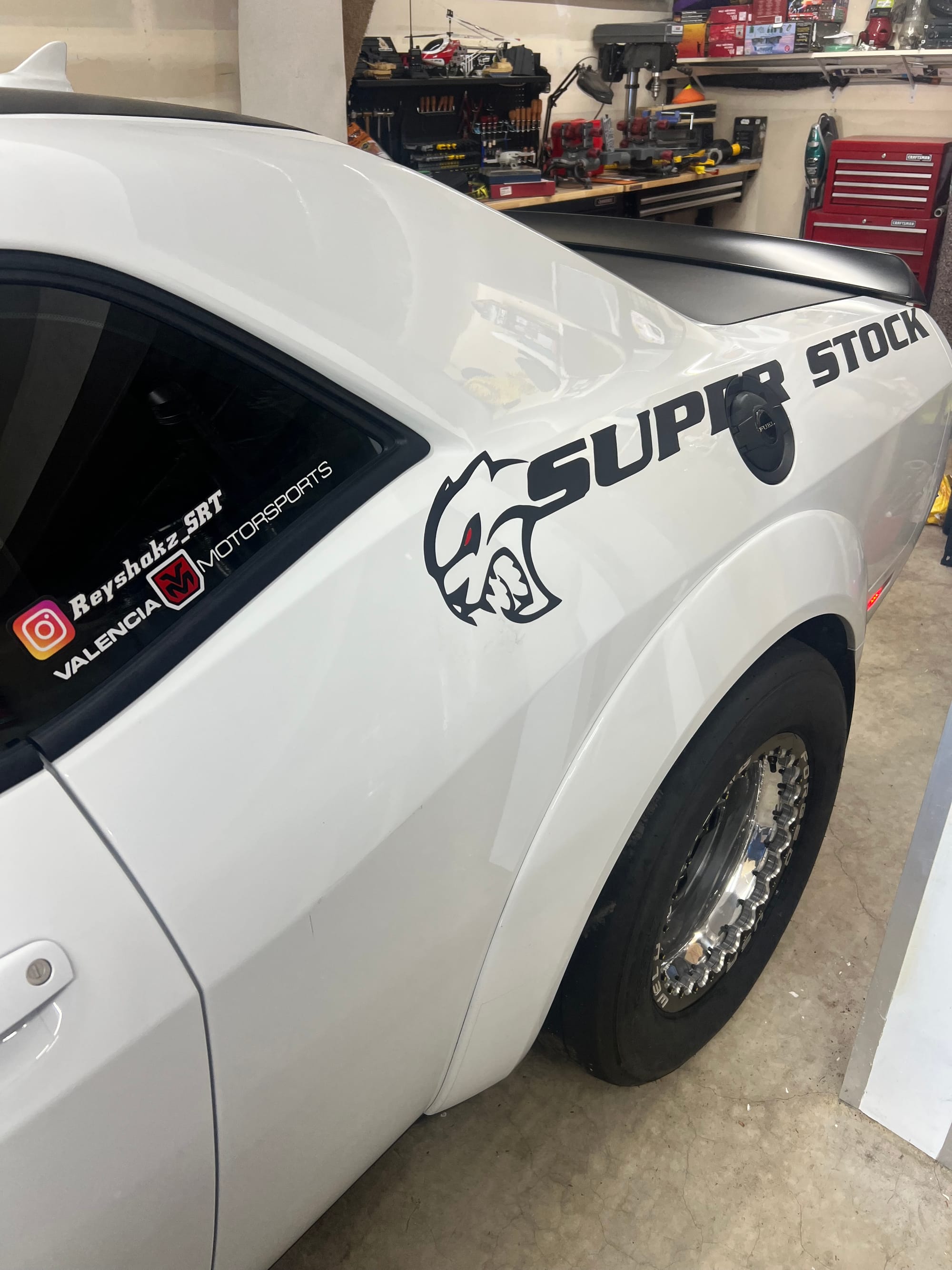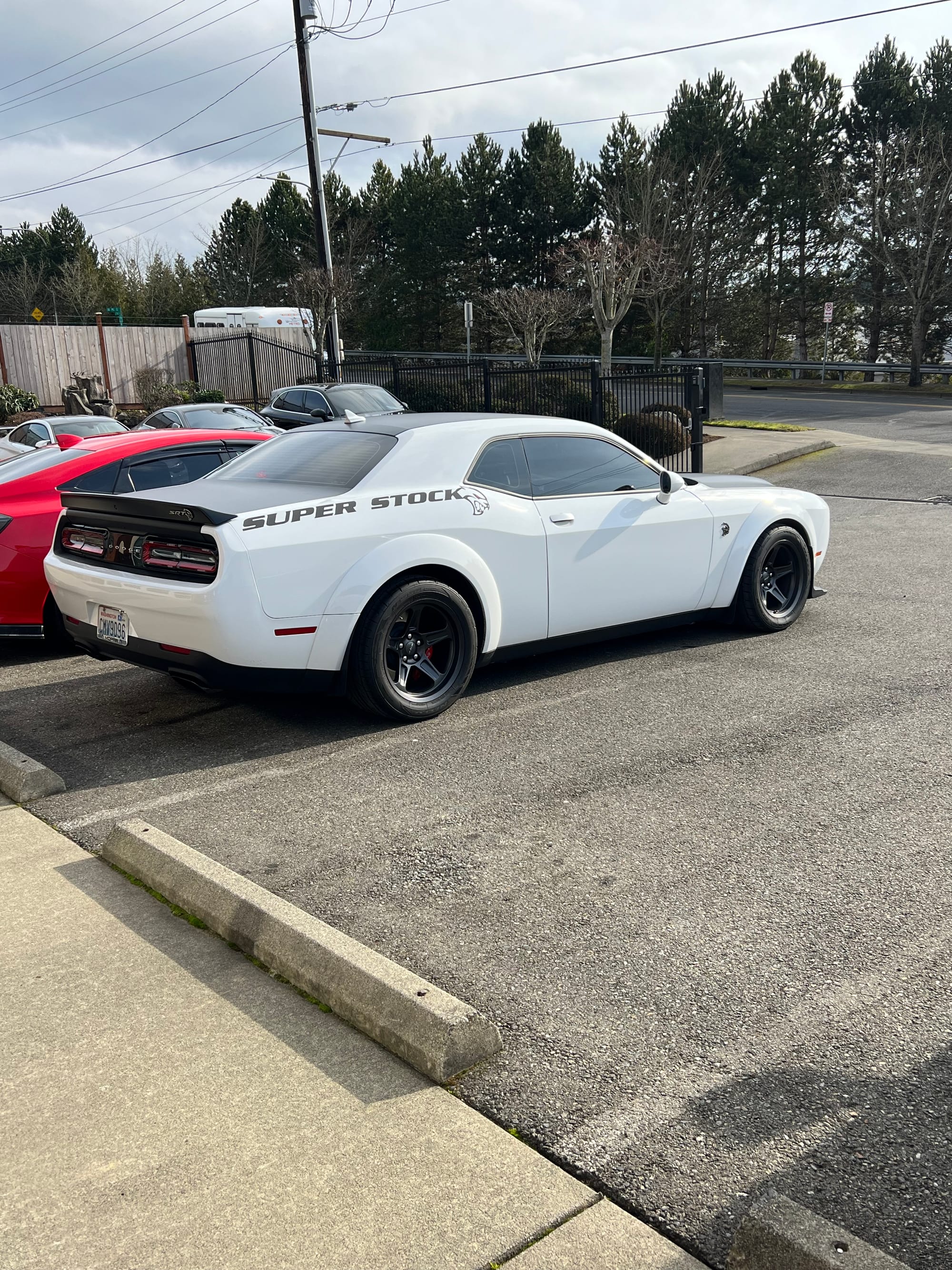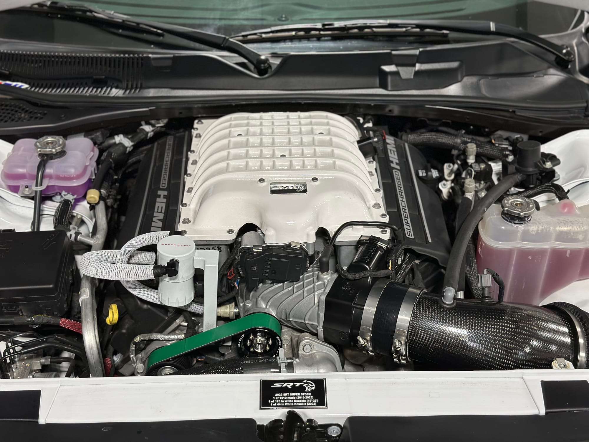 1130whp 2022 Dodge Challenger SRT Super Stock in White Knuckle with 5,840 miles for sale! This Super Stock was modified by Valencia Motorsports in Richland, WA, featuring a well documented setup with over $25K in modifications alone. Powered by a 6.2L HEMI that’s topped with a Kong CNC ported 2.7L IHI supercharger, and mated to an 8HP90 8-speed automatic transmission. The supercharger system utilizes a 2.75” Griptec upper/10% IW overdrive lower pulley combination, followed by a Gates green belt, Kong 108mm throttle body, and Legmaker carbon fiber cold air intake. The fuel system consists of twin Walbro 525lph pumps with a Kenne Bell Boost-A-Pump (BAP), FIC 1650cc fuel injectors, and a flex fuel kit to run E85. Further equipped with a DSS 4” 1-piece aluminum driveshaft, Per4mance Development DIRS differential brace, HHP Demon Killer springs, rear cradle lockout bushings, Kirkey Series 55 seats with red covers, and more. Tuning was completed via HP Tuners by Valencia Motorsports with an output of ~1000whp on pump 92 octane, and 1130whp on E85. As for performance metrics, the car went 60-130mph in 5.15s at 4600Ibs with the driver, and 100-150mph in 4.92s. The car can be sold with a rear pair of 17x11 WELD Racing RT-S S71 beadlock wheels wrapped in 315/50/17 Mickey Thompson ET Street R drag radials (pictured) for an additional $3700, otherwise it’ll come with OEM 18x11 Super Stock wheels all around with OEM Nitto NT555 G2 tires. Both sets of seats will be included with the sale (OEM seats and Kirkey seats). The custom “Super Stock” decals can be removed upon request and confirmation of sale. There are currently 750 miles on the setup! All receipts of maintenance and modifications are available upon request! Financing is available! Clean title!