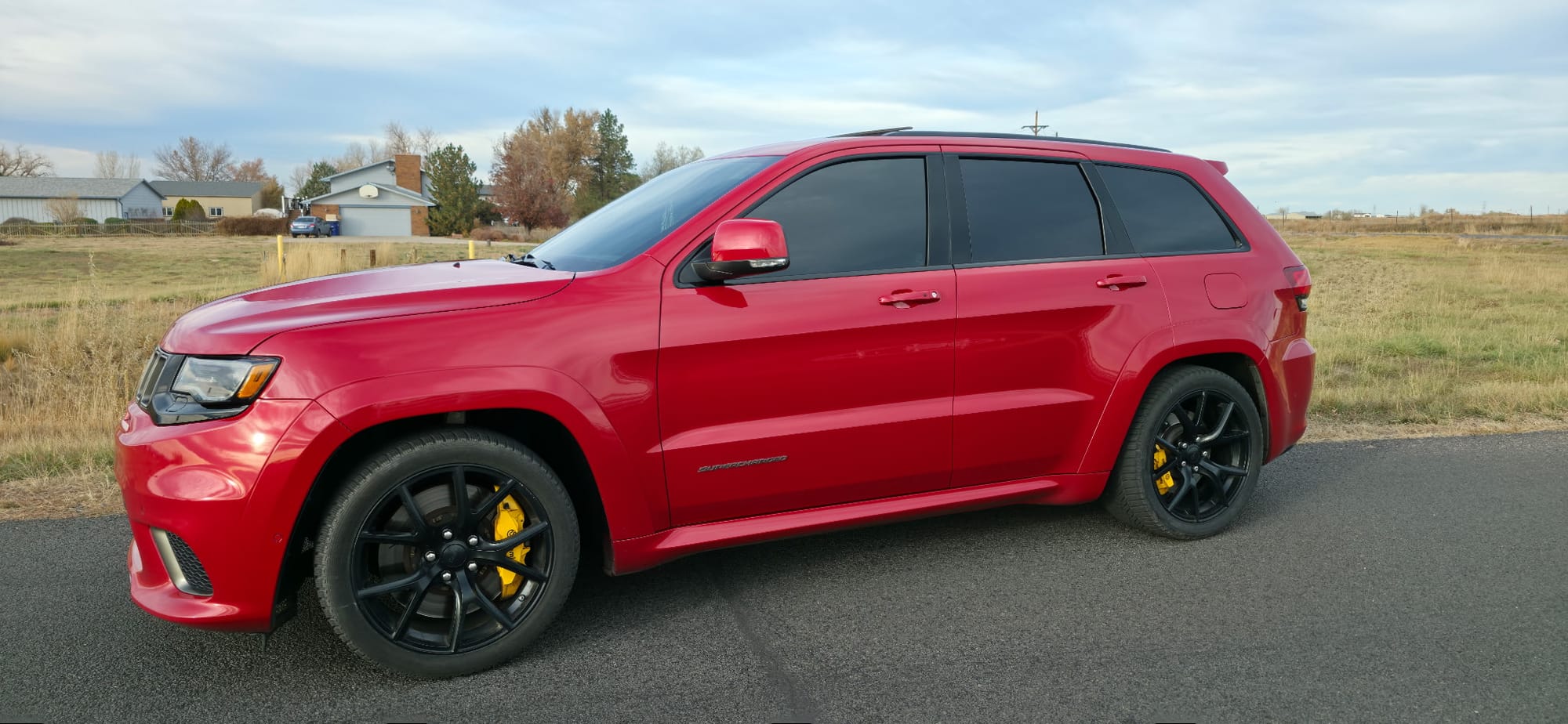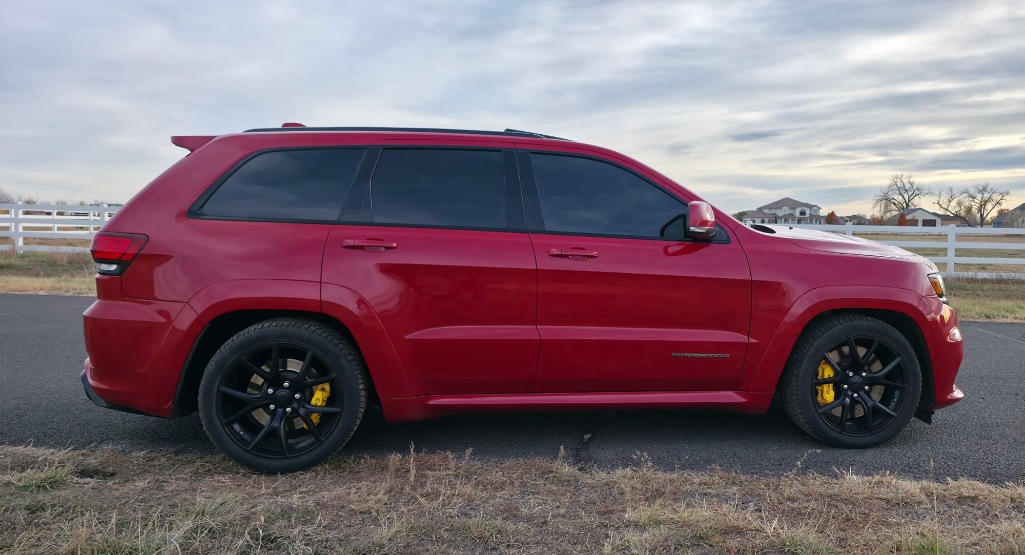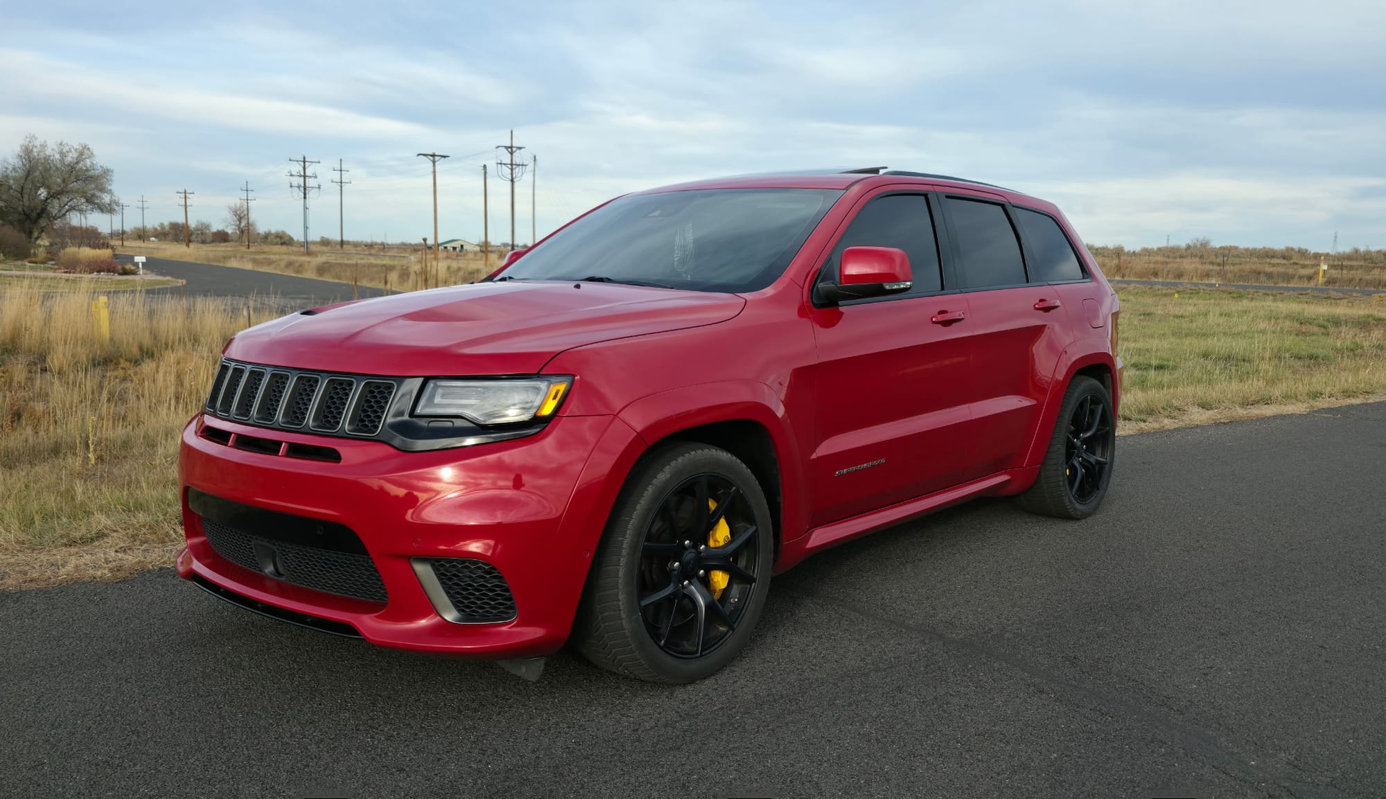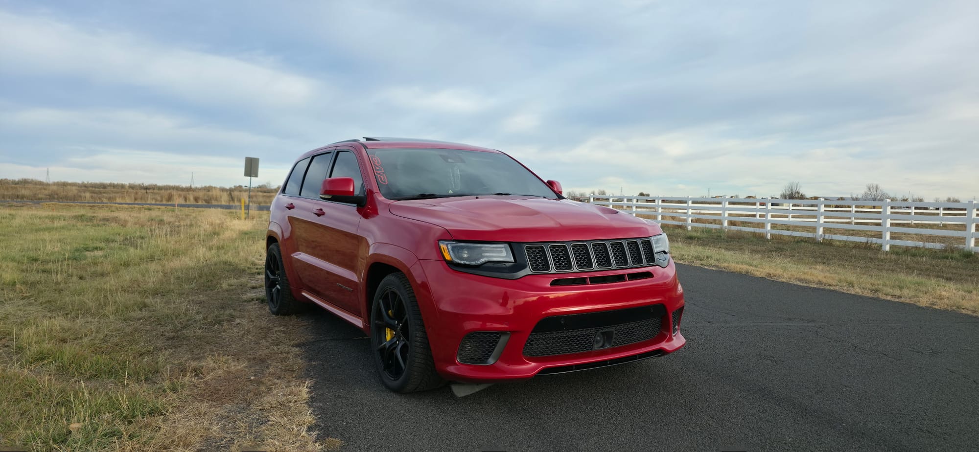 1136whp 2018 Jeep Grand Cherokee Trackhawk in Redline with 77,000 (Chassis) miles for sale! The heart of this Trackhawk consists of a 411ci stroker with a ported/race built 2.4L IHI supercharger on top, power generated from this combination is transferred to all 4 wheels through a Southern Hotrod built 8HP95 8-speed automatic transmission. The engine build begins with a Mopar block, which was fitted with an MMX 411 1500hp rotating assembly, MMX 411 blower camshaft, Edelbrock heads, new Hellcat lifters, custom pushrods, and rocker shaft braces. Additional key components include a Kong throttle body, K&N cold air intake, Fi Interchiller stage 1/1” spacer and blanket, front and rear differential braces, lowering springs, and more. The owner did the engine work, RPM did the upgrades, and tuning work was completed by ZHtunes with an output of 1136whp/1109wtq on the dyno. There are no track times with the current configuration, however before this engine/transmission combination, it ran a 10.55 with 940whp. There are currently 10K miles on the engine build, and 20K miles on the transmission build.