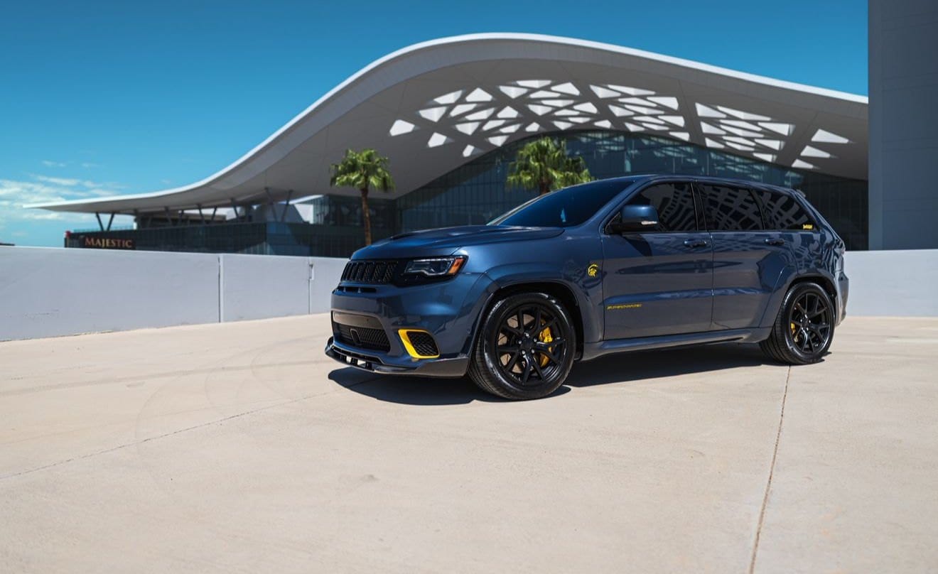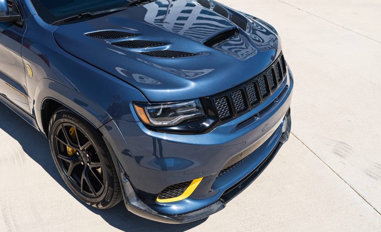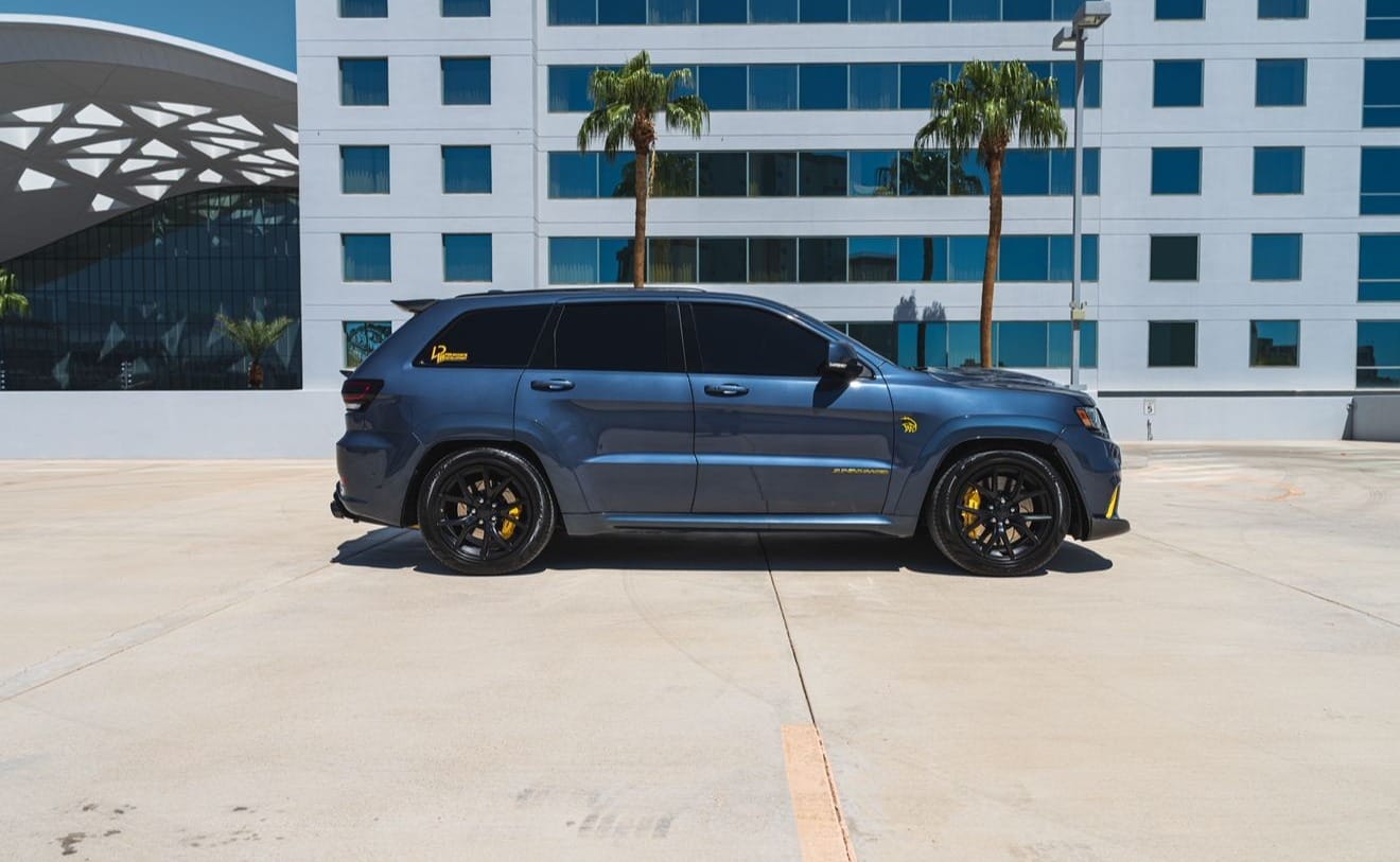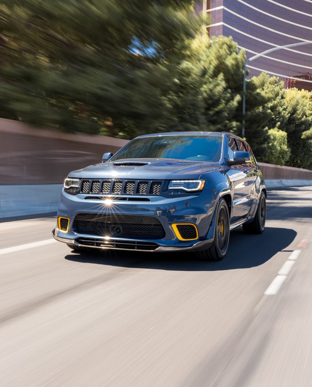 1300+awhp 2019 Jeep Grand Cherokee Trackhawk in Slate Blue with 27,000 (Chassis) miles for sale! This incredibly fast 8-second Trackhawk was built and tuned by RSPDMV, the entire build was well documented with over $150K in invoices showcasing every single thing done to the vehicle. Not only is this Trackhawk heavily modified, but it’s also a very rare spec with it being 1 of only 20 Slate Blue Trackhawks produced for the USA market in 2019. Sporting a monstrous Demon Performance 426ci engine with a 3.8L Whipple Stage 2 supercharger kit, this beast churned out over 1300awhp on the biggest pulley. Diving deeper into the engine build, the 426ci was fitted with billet mains, a forged crankshaft, AFR high flow racing heads, upgraded camshaft (matched for Whipple setup), and a pair of billet valve covers (powder coated yellow), just to name a few. The drivetrain features a Sipple built 8HP95 8-speed automatic transmission along with a Sipple built transfer case. Additional upgrades include a Big Gun air intake, 2100cc fuel injectors, Stage 3+ I/C Interchiller, and more. As for track times, this Trackhawk previously ran an 8.9 in the 1/4-mile with the old engine (same setup). There are currently only 100 miles on the new engine build! Clean title!