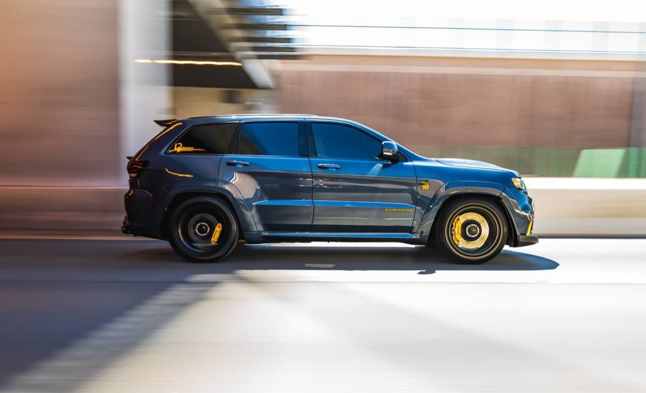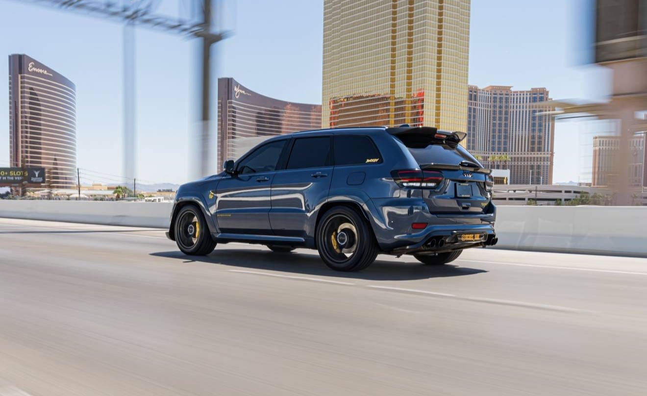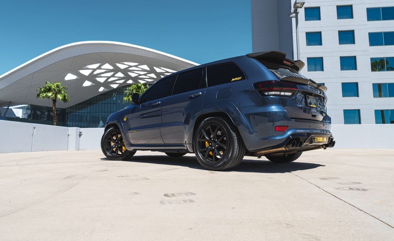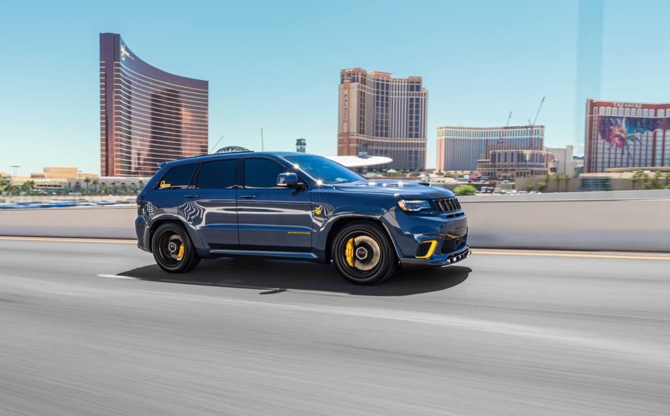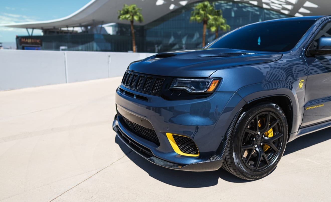 1300+awhp 2019 Jeep Grand Cherokee Trackhawk in Slate Blue with 27,000 (Chassis) miles for sale! This incredibly fast 8-second Trackhawk was built and tuned by RSPDMV, the entire build was well documented with over $150K in invoices showcasing every single thing done to the vehicle. Not only is this Trackhawk heavily modified, but it’s also a very rare spec with it being 1 of only 20 Slate Blue Trackhawks produced for the USA market in 2019. Sporting a monstrous Demon Performance 426ci engine with a 3.8L Whipple Stage 2 supercharger kit, this beast churned out over 1300awhp on the biggest pulley. Diving deeper into the engine build, the 426ci was fitted with billet mains, a forged crankshaft, AFR high flow racing heads, upgraded camshaft (matched for Whipple setup), and a pair of billet valve covers (powder coated yellow), just to name a few. The drivetrain features a Sipple built 8HP95 8-speed automatic transmission along with a Sipple built transfer case. Additional upgrades include a Big Gun air intake, 2100cc fuel injectors, Stage 3+ I/C Interchiller, and more. As for track times, this Trackhawk previously ran an 8.9 in the 1/4-mile with the old engine (same setup). There are currently only 100 miles on the new engine build! Clean title!
