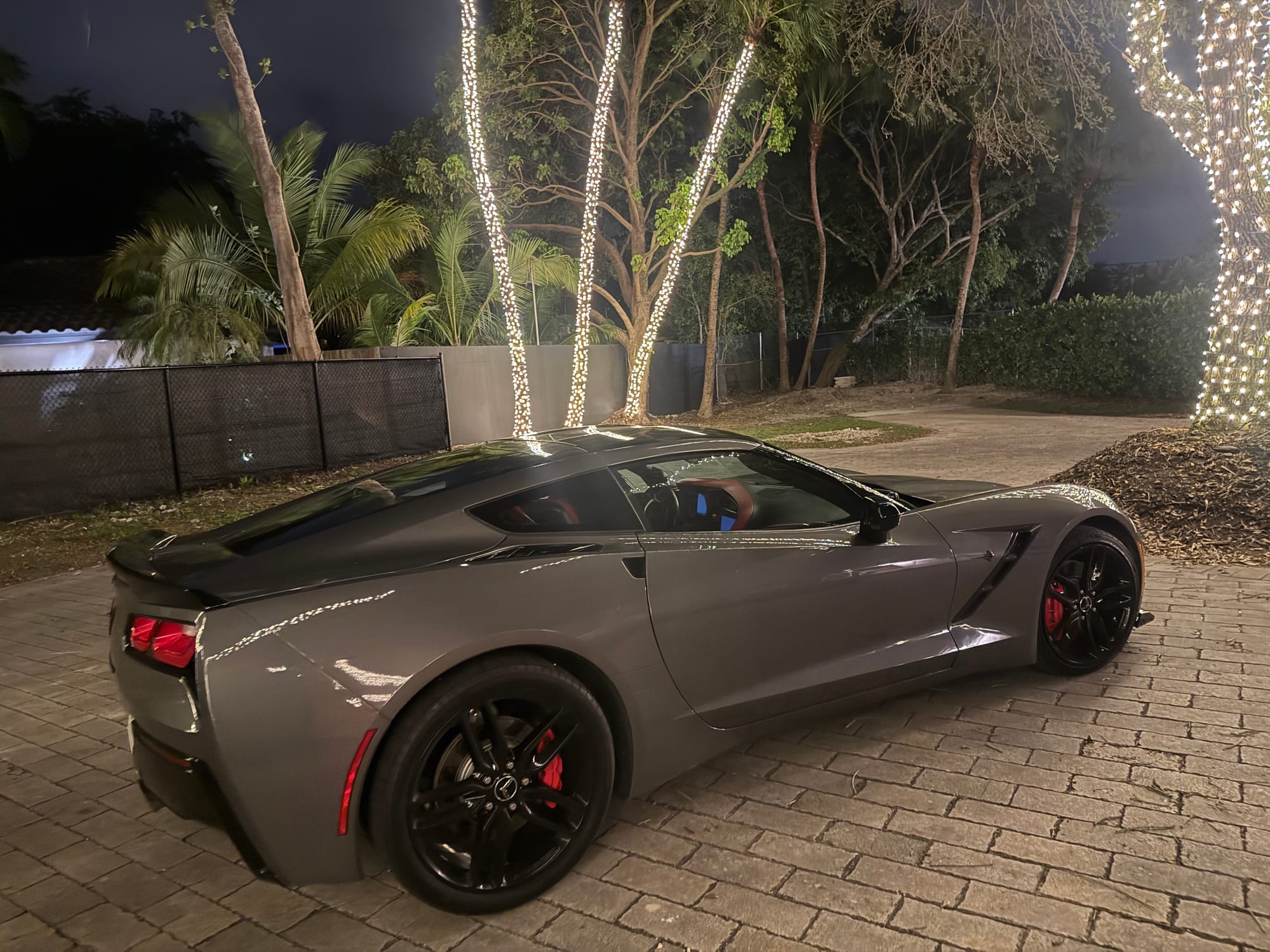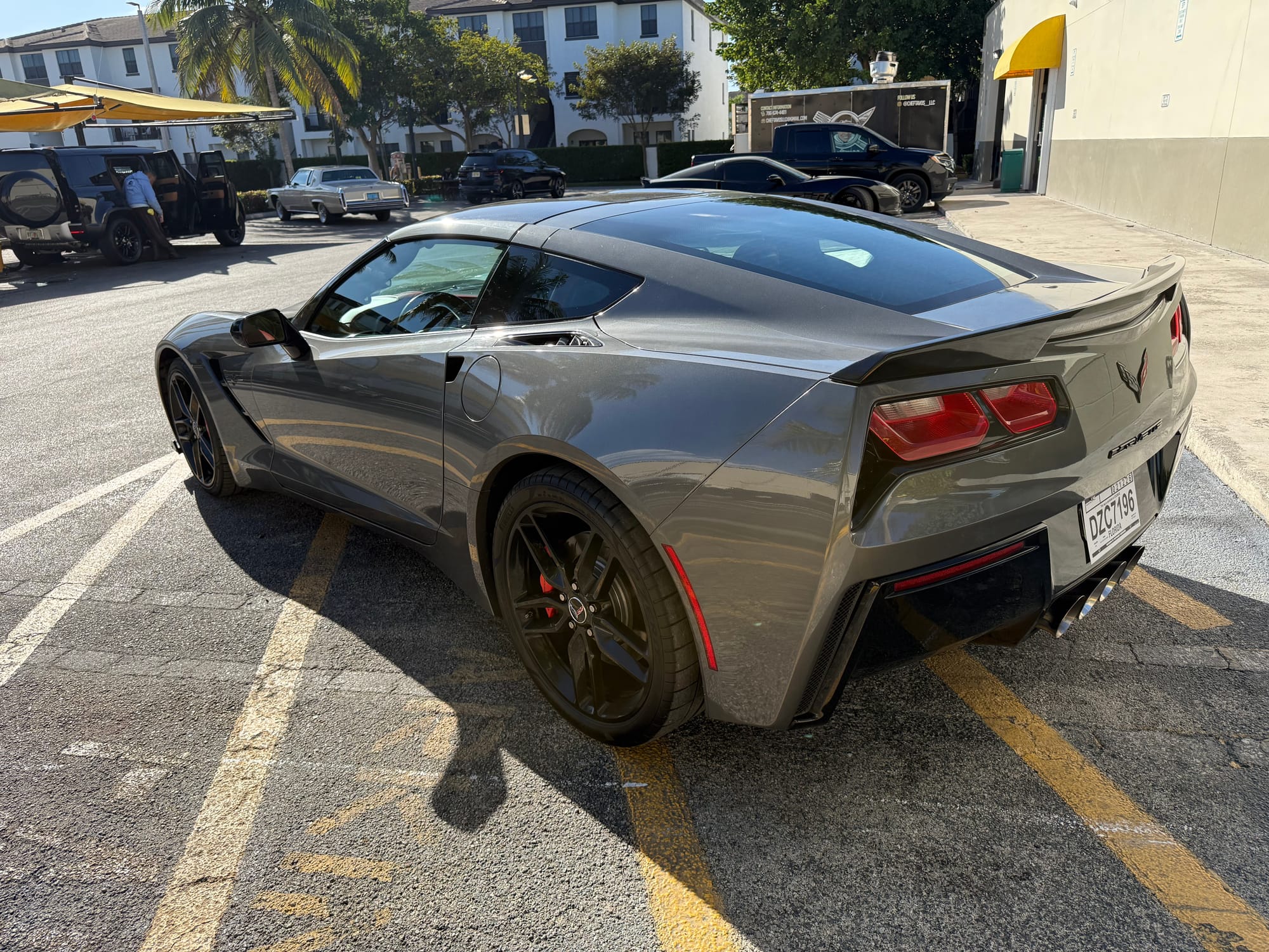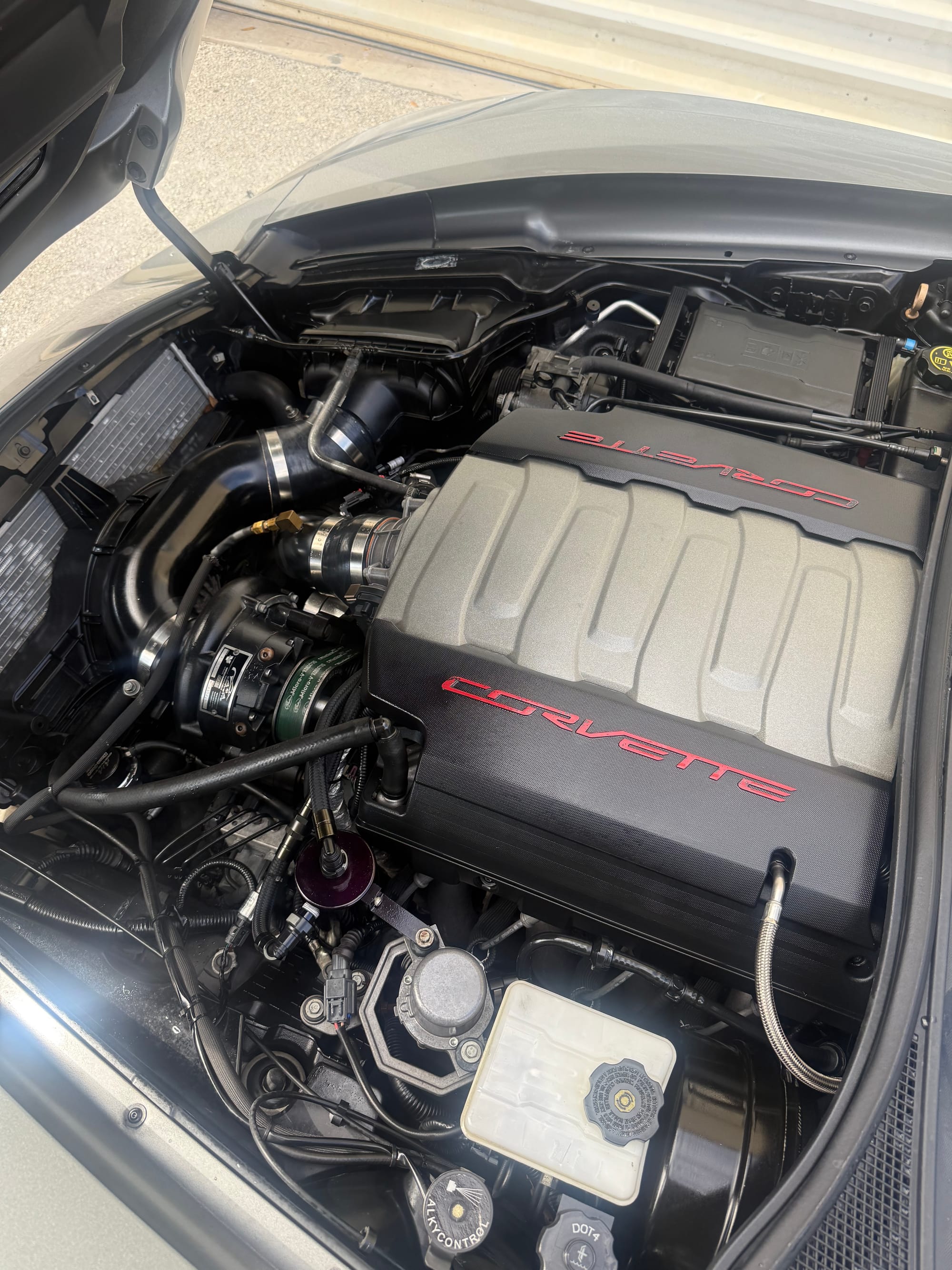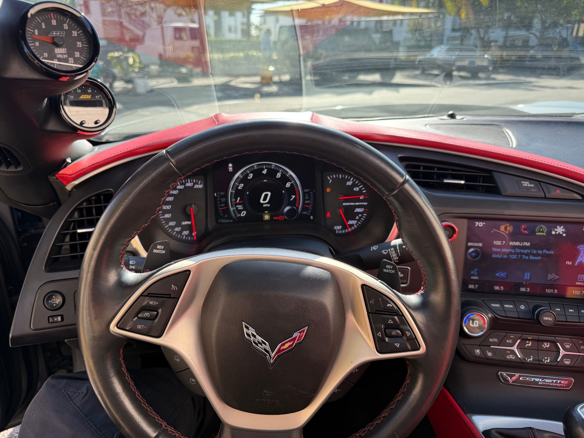 2015 Chevrolet Corvette Stingray Z51 in Shark Gray with 77,500 miles for sale! This C7 is powered by a cammed 6.2L LT1 that’s paired with an A&A supercharger (Vortech V-3 SI head unit), and linked to a Tremec TR-6070 7-speed manual transmission with a Tilton racing clutch. The LT1 was fitted with a Texas Speed Stage 2 camshaft along with an oil catch can. Further equipped with a DSX auxiliary fuel pump, Corsa headers, off-road x-pipe, AEM boost gauge, and an AEM air/fuel ratio (AFR) gauge. The owner purchased the vehicle with the modifications already installed, it was later revised by a local performance shop, and the car was street tuned by Max Effort Tuning. Everything is in perfect mechanical condition, however there are a few areas that need to be addressed in terms of aesthetics. The vehicle does have the common dash peel by the windshield, the exterior needs a paint correction, and the carbon roof needs to be re-cleared. Clean title!