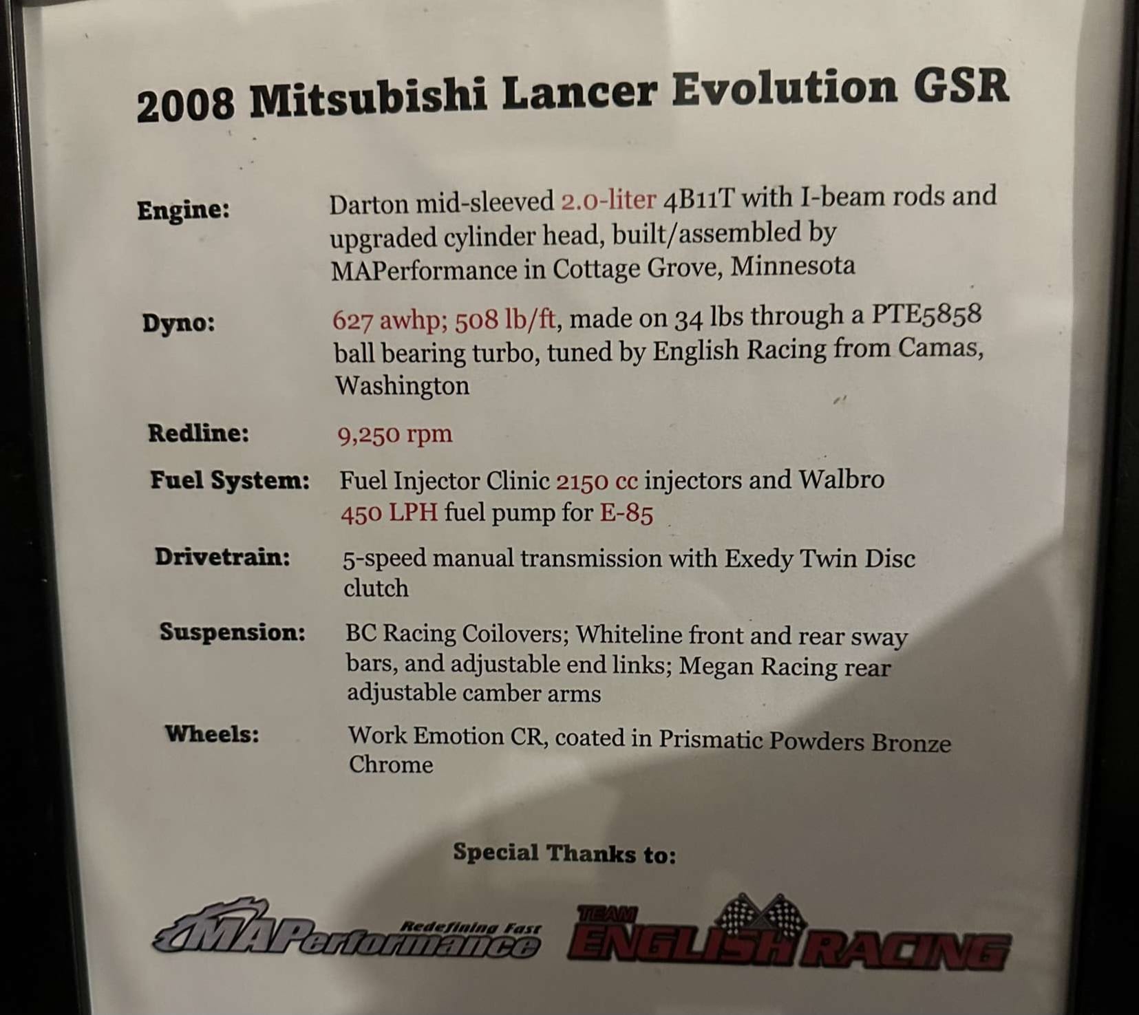672awhp 2008 Mitsubishi Lancer Evolution X GSR in Phantom Black Pearl with 92,000 (Chassis) miles for sale! This Evo X is an absolute riot on the streets, built by MAPerformance with just under 700awhp on tap. It’s powered by a built/Darton MID-sleeved 2.0L 4B11T that’s matched with a MAP complete T3 turbo kit, which employs a PTE PT5858 ball bearing turbo. The fuel system features a Walbro 450LPH E85 in-tank fuel pump along with a set of Fuel Injector Clinic 2150cc fuel injectors. Power is transferred to all 4-wheels through a 5-speed manual transmission that’s coupled with an Exedy twin disc clutch. Additional upgrades include a set of BC Racing coilovers, Whiteline front/rear sway bars, Megan Racing rear adjustable camber arms, Work Emotion CR wheels, short throw shifter, Mishimoto oil/transmission cooler, and much more. Tuning was completed by English Racing with an output of 672awhp/508awtq on E85. The previous owner didn’t have all of the build sheets, however what was provided will be included in the photos, there’s tons of additional parts that aren’t listed. There are currently 15K miles on the engine build, which was installed back in 2016. Clean title!