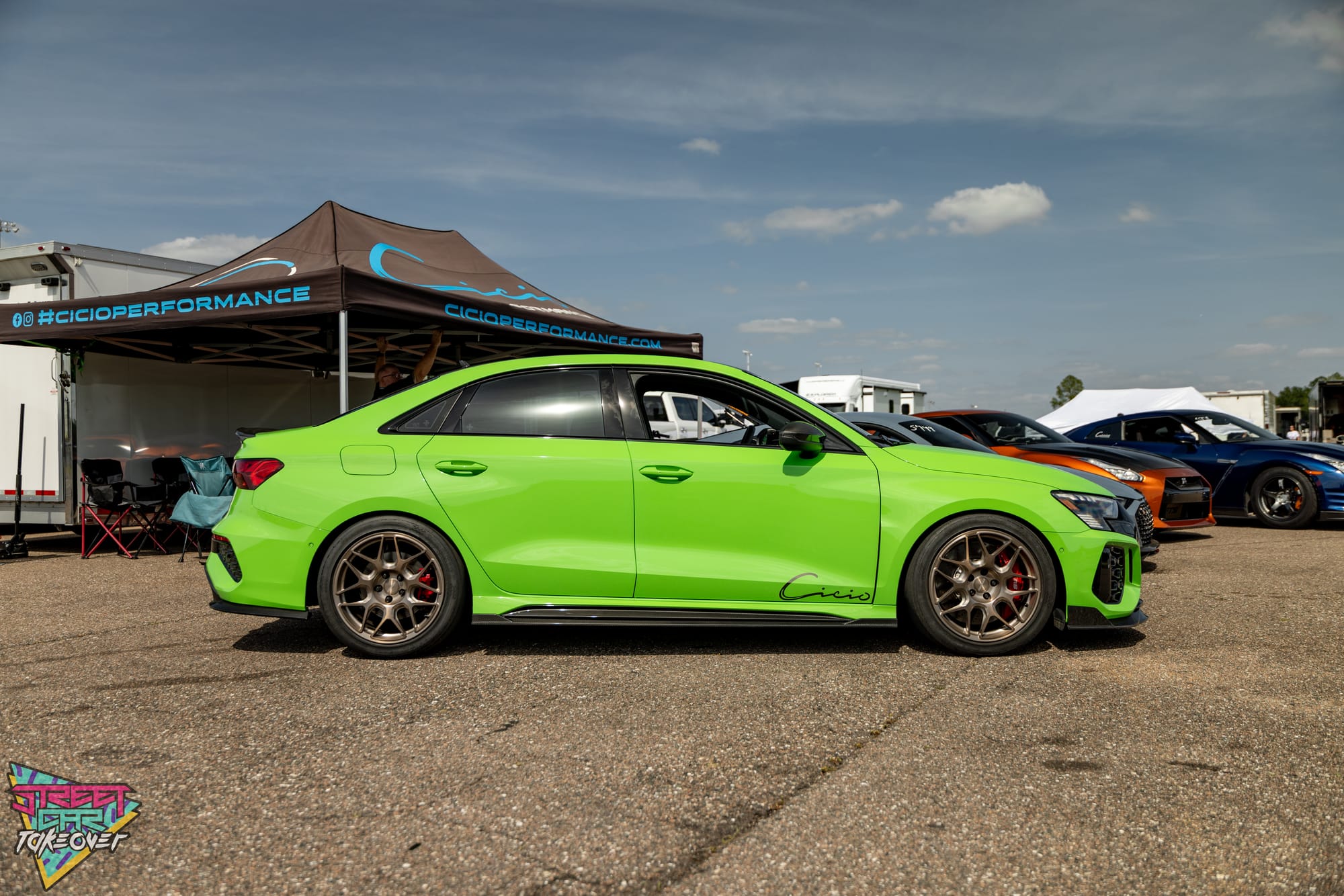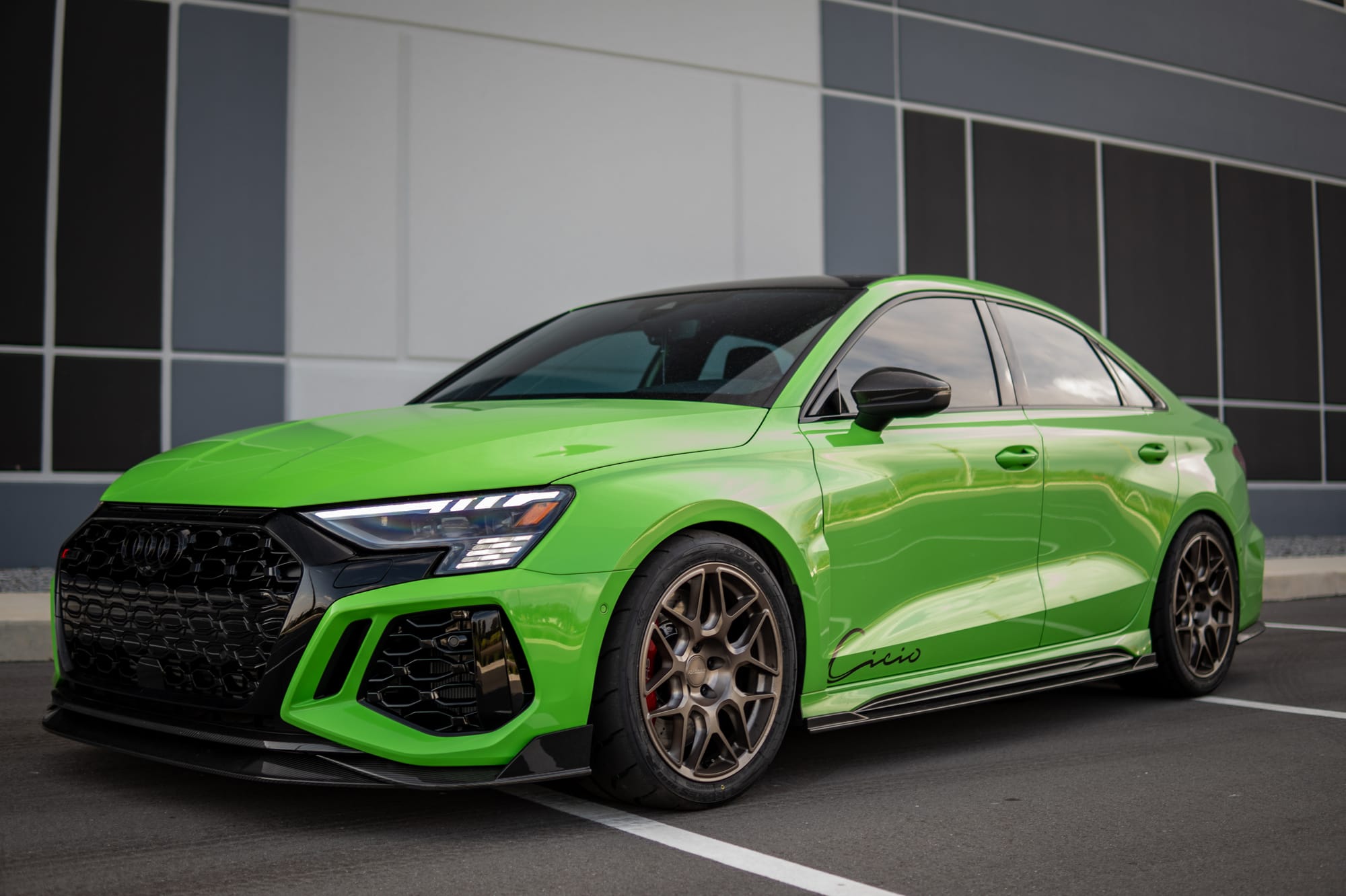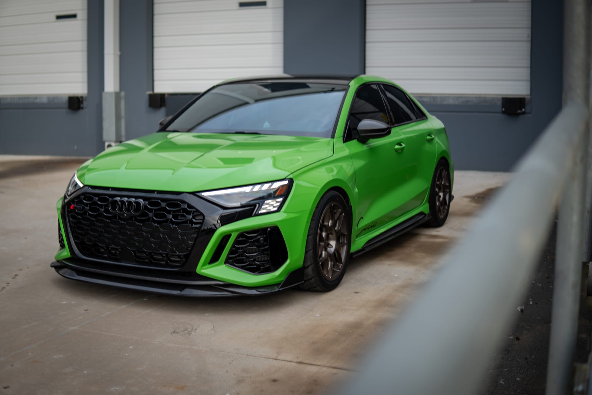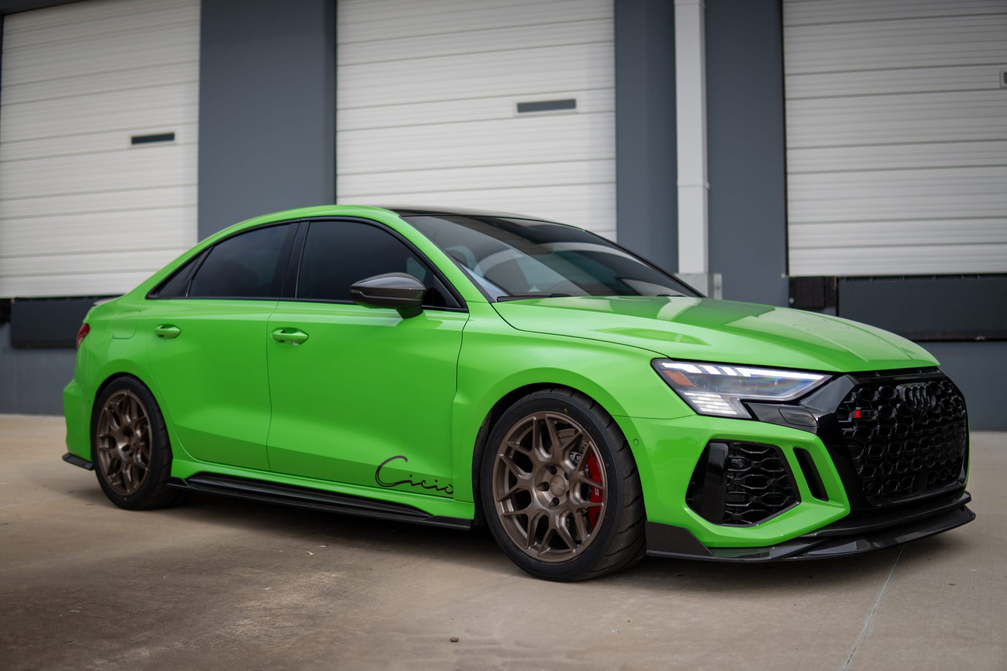 703whp 2024 Audi RS3 in Kyalami Green with 9,300 miles for sale! This 8Y RS3 was modified by Cicio Performance, armed with their C700 Package, which includes Cicio’s in house calibration along with all supporting modifications to push just over 700whp. Powered by a 2.5L TFSI 5-cylinder engine with a Hybrid turbo, power generated from this combo is delivered to the Quattro all-wheel-drive system through a 7-speed dual-clutch transmission. Key performance upgrades include a Unitronic turbo inlet, IROZ intake/FMIC/charge-pipe/downpipe, 1000cc fuel injectors, Unitronic dogbone mount, Cicio brushless pump controller, 485 stainless valved exhaust, upgraded MAP sensor, and a KW lowering sleeve kit. Tuning was completed via Syvecs standalone by Cicio Performance with an output of 703whp/540wtq. The exterior looks phenomenal as the front end/all high-impact areas were topped with Paint Protection Film (PPF), and the full-exterior was ceramic coated as well for additional protection, both professionally applied by Presidential Detail. There are currently only 1,500 miles on the setup with invoices for the work performed! Clean title!