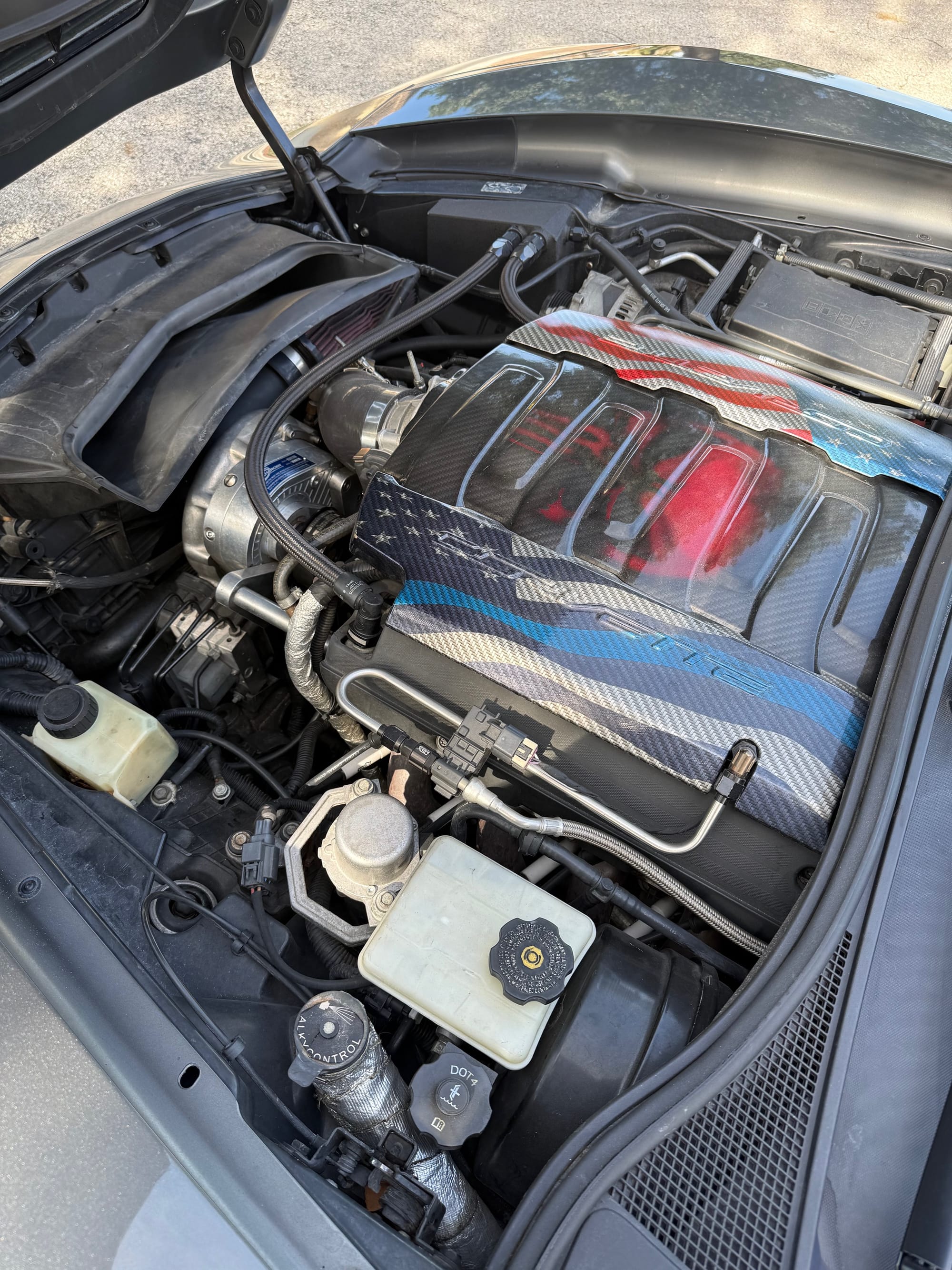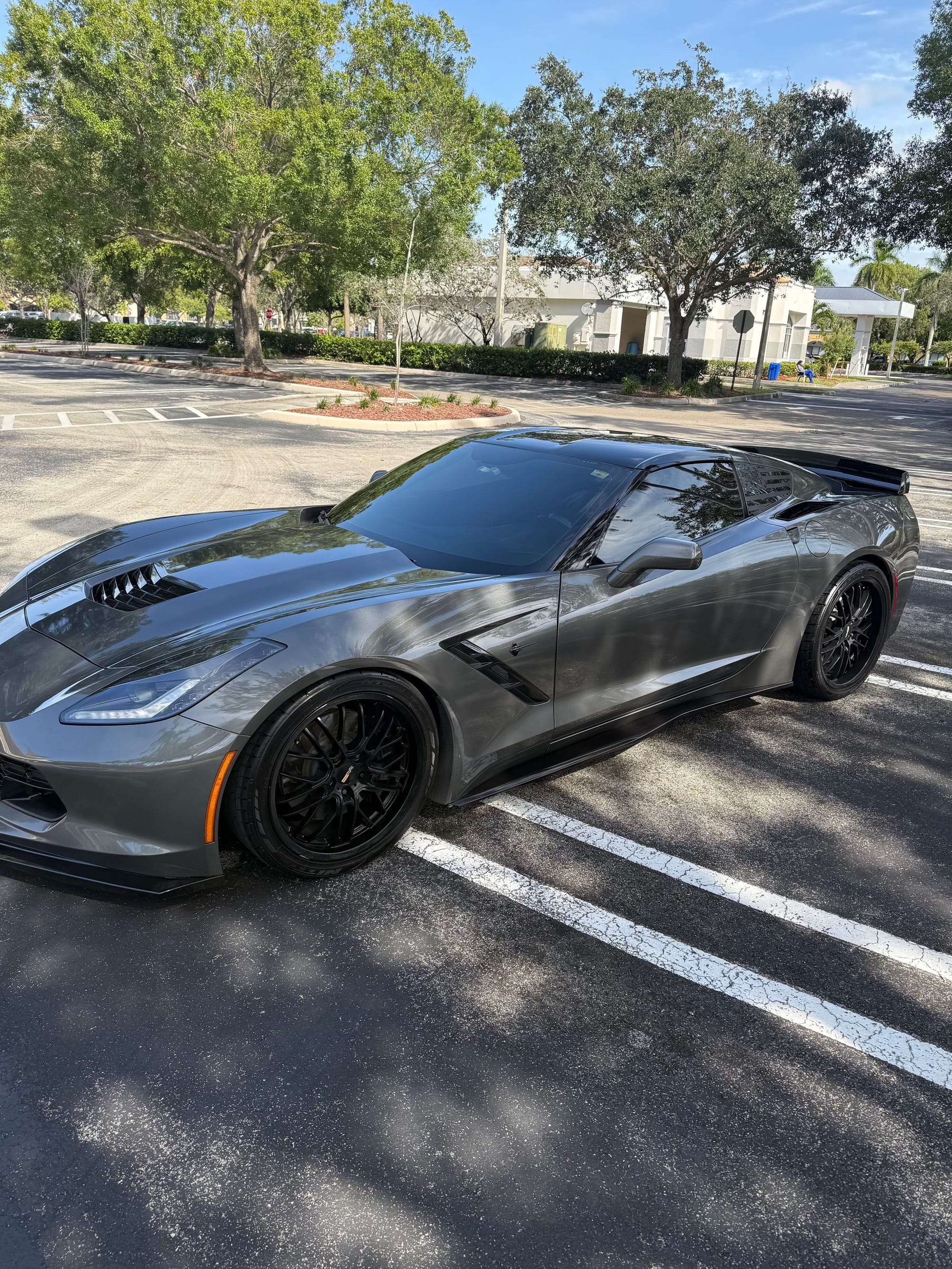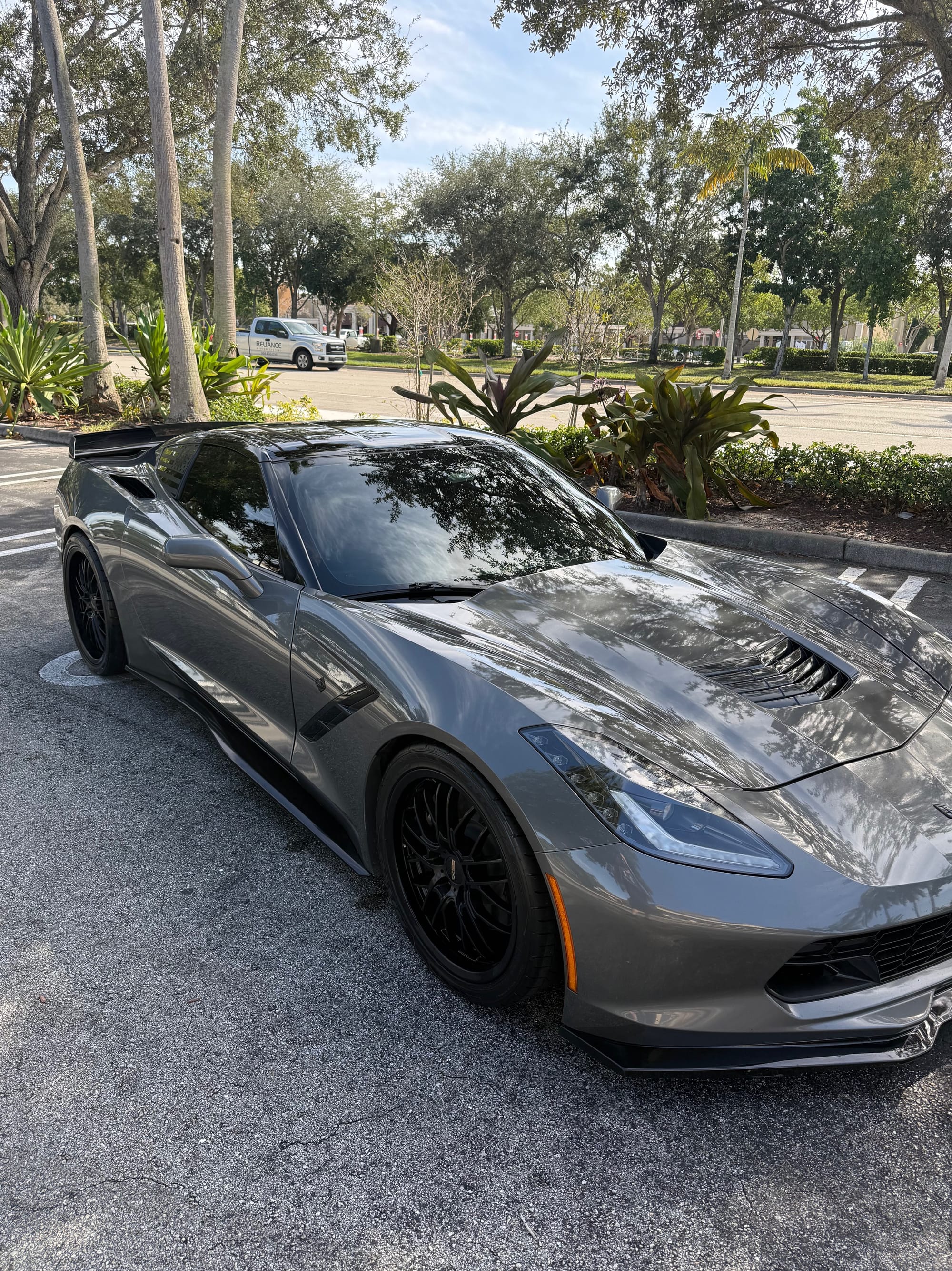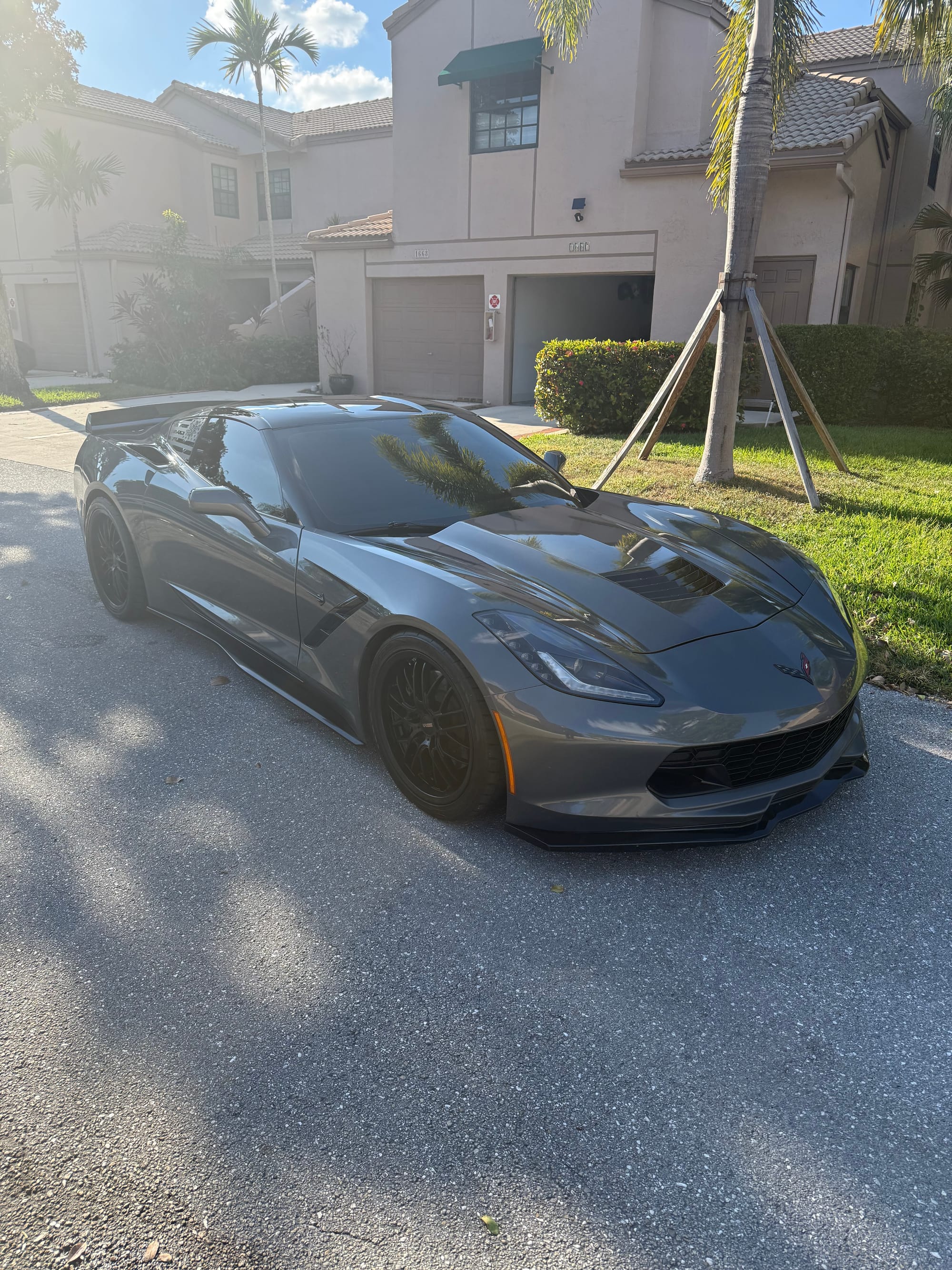 797whp 2015 Chevrolet Corvette Stingray 1LT Z51 in Shark Gray with 48,100 (Chassis) miles for sale! This C7 was built by Mera Motorsports, equipped with a solid setup that generated 797whp on E85 after tuning was finalized by Edgard of DSMlights Tuning. Beneath the hood lies an LT1 that’s fitted with a fully forged bottom end (pistons, rods, etc.) and P-1SC-1 ProCharger, this combination is trailed by the a Tremec TR-6070 7-speed manual transmission. Following the forged bottom end, the engine also features a set of ported and polished heads, upgraded camshaft, and DOD delete. The fuel system consists of a DSX auxiliary fuel pump along with a set of Z06 fuel injectors, and a flex fuel sensor. Additional modifications include a pair of American Racing headers, x-pipe, high flow cats, Alky Control methanol injection kit, MGW short throw shifter, and a handful of aesthetic components. The car will also come with a pair of Aventador style tail lights, which were never installed. There are currently 22K miles on the build. Clean title!