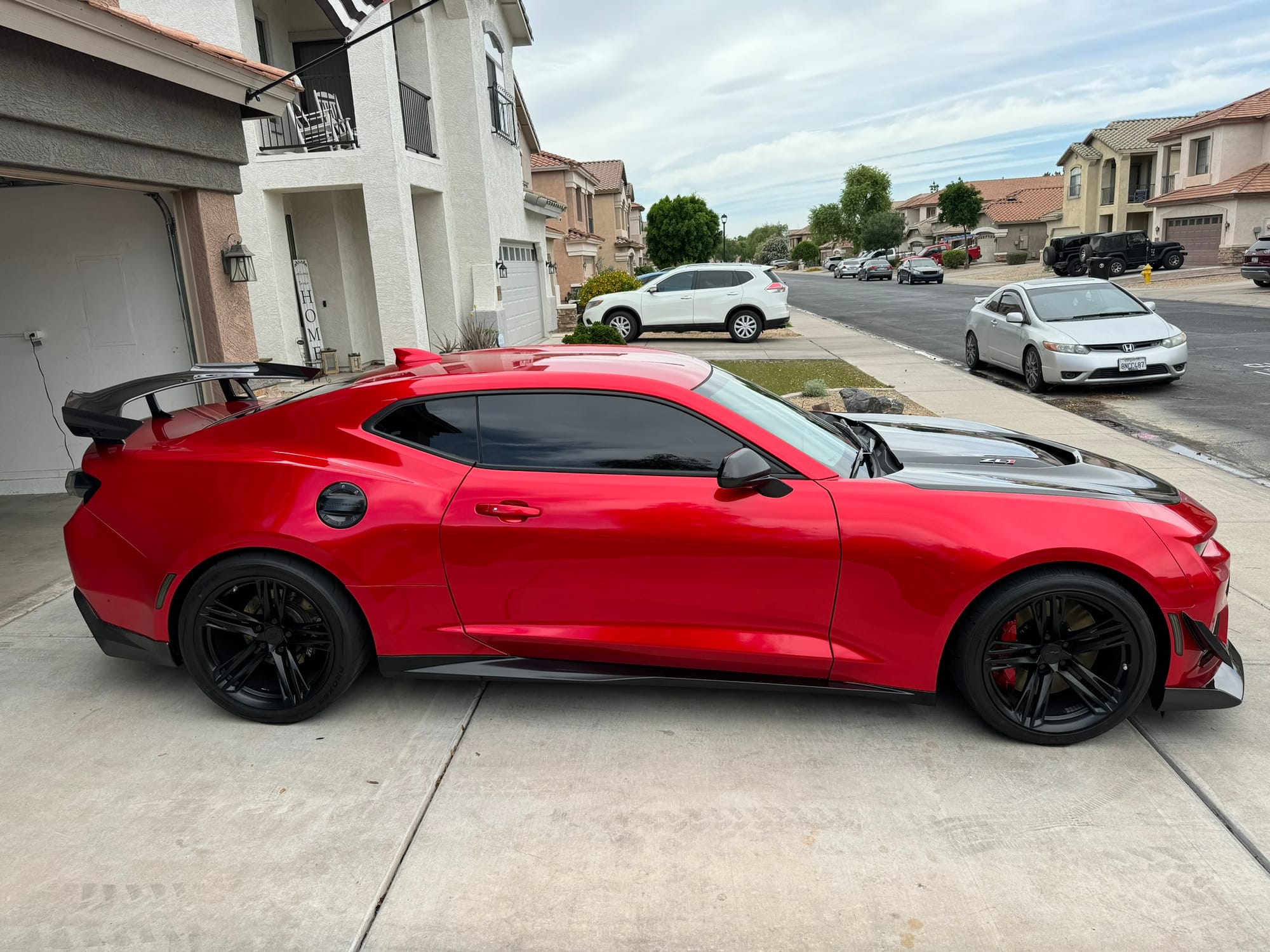 876whp 2018 Chevrolet Camaro ZL1 1LE in Red Hot (Wrapped in TeckWrap “True Blood”) with 20,700 miles for sale! This ZL1 1LE was meticulously maintained, garage kept, and tastefully modified to maintain an elevated OEM look/driving experience with an output of 876whp/793wtq on a conservative tune. Power is sourced from a H/C 6.2L LT4 that’s topped with a 2.9L Whipple supercharger system, and linked to a Tremec TR-6060 6-speed manual transmission. More specifically, the LT4 was fitted with AMP’s “VVT-LOLT” custom grind camshaft along with a pair of WCC Stage 2 ported/polished cylinder heads, upgraded dual valve springs with titanium retainers, chromoly pushrod, and ARP head bolts. As for the fuel system, this setup utilizes a Lingenfelter big bore LT4 high pressure fuel pump, and a flex fuel kit. Additional key components include a Nick Williams 103mm throttle body, Roto-Fab Big Gulp CAI, Kooks long tube headers/off-road mid-pipe, Borla quad tip catback exhaust, ARS/Alky Control M1 methanol injection system, Carlyle 15” rear brake conversion, and numerous carbon fiber interior/exterior components. Another 100+whp could be made on the current build with a smaller pulley setup and more aggressive tune. Clean title and Carfax!