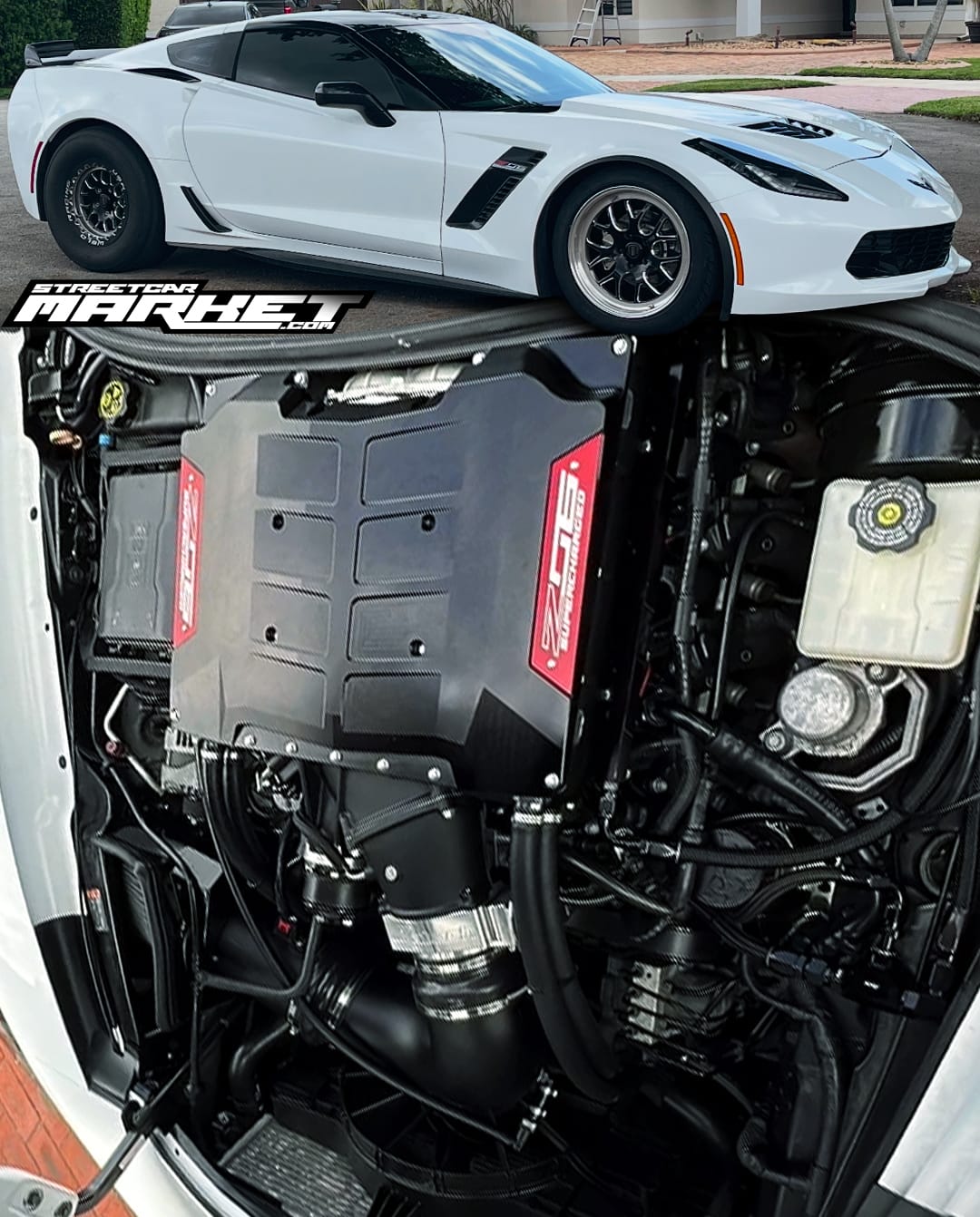 1077whp 2017 Chevrolet Corvette Z06 in Arctic White with 18,500 (Chassis) miles for sale! This C7Z is powered by a 415ci LT4 stroker that’s topped with a Magnuson supercharger, and trailed by an 8L90 8-speed automatic transmission. The engine build utilizes a new GM LT4 block, which was fitted with JE pistons/rods, Texas Speed cam kit, Frankenstein ported heads, Katech high capacity dry sump oil pump, LME billet VVT delete front cover, and more. The fuel system features TooHighPSI port injection along with a Fore Innovations triple pump fuel system, DSX fuel pump kit, flex fuel sensor, and a set of FIC 1000cc injectors. Additional upgrades include a Katech 103mm throttle body, Roto-Fab Big Gulp intake, ARH headers, Cordes HX, Cordes expansion tank, WELD Racing drag pack, and TBM brakes. Modifications were installed by Jay Performance, and tuning was handled by Max Effort Tuning with an output of 1077whp/1050wtq blower only. The owner will also include a Nitrous Outlet nitrous system with the bottle and bracket. There are currently only 1,200 miles on the build (1,000 break in miles). Invoices are available! Clean title!
