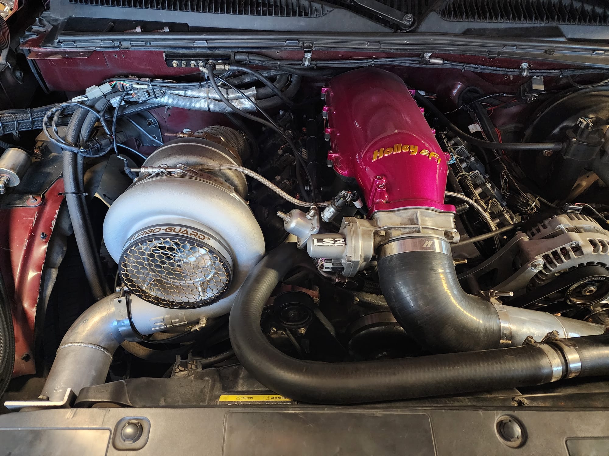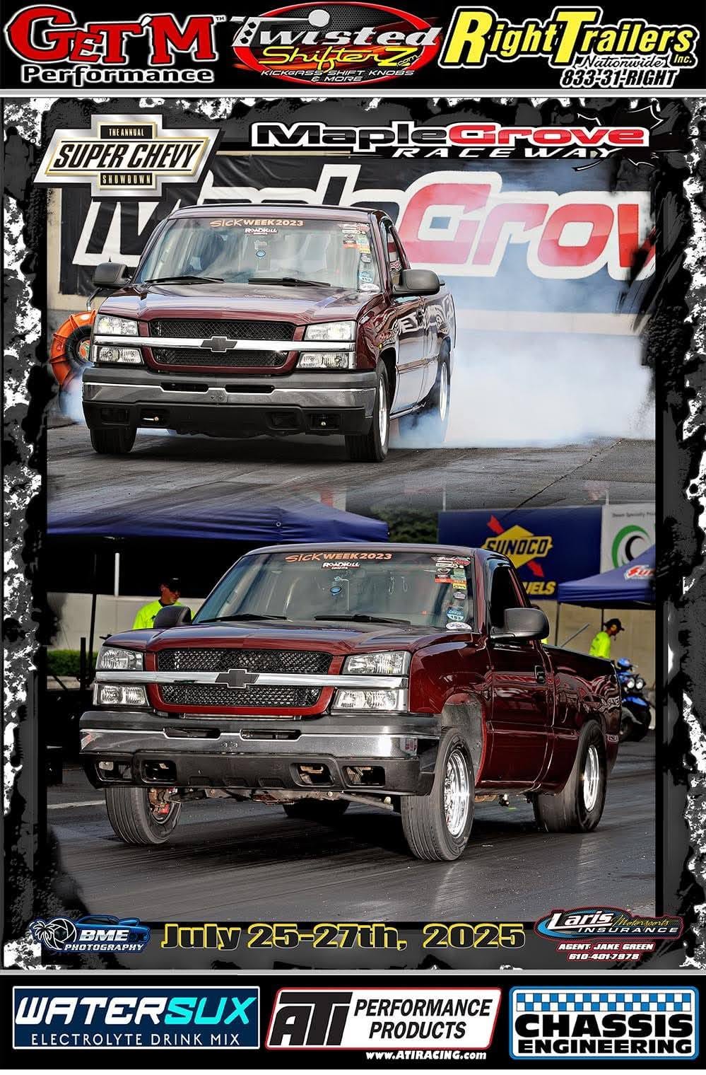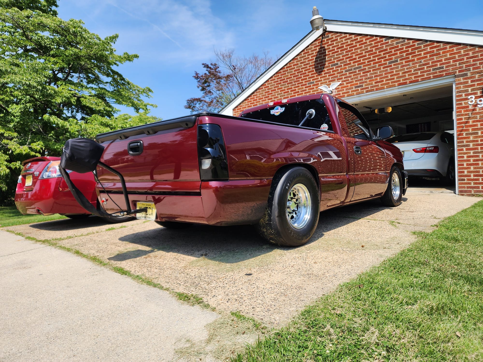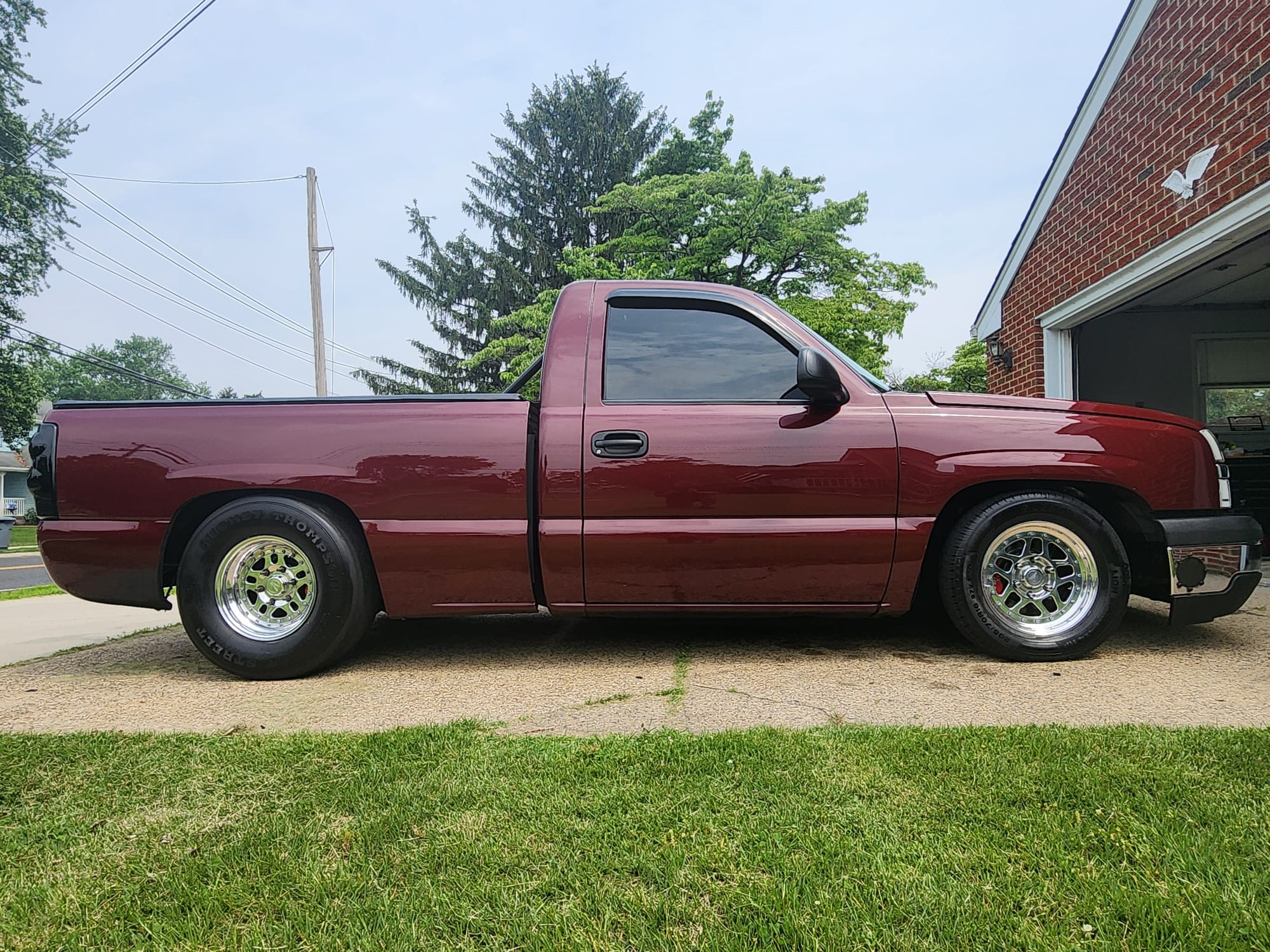 1190+whp 2003 Chevrolet Silverado 1500 in Dark Carmine Red with 110,000 (Chassis) miles for sale! This incredibly fast 8-second RCSB Silverado was built by Kasper’s Korner Automotive, outfitted with an arsenal of high quality components. Power is derived from a 402CI stroker that’s coupled with an FIS GTR S450 94/104 turbo, and linked to a fully built TH400 transmission. The engine build makes use of a 6.0 iron block as its base, which was stroked to a 402CI with a Callies Compstar CCW crankshaft, Wiseco Boostline rods, and LS2K pistons with ARP hardware throughout. The top end of the engine features a custom grind camshaft along with a set of PRC 220 heads, and a Holley hi-ram intake manifold. The fuel system features 2 Magnafuel 4303 pumps with -10 lines, 20 gallon fuel cell, flex fuel sensor, and a set of Bosch 220Ib fuel injectors. As for the drivetrain, the built transmission is trailed by a 9” from Got Torque Differential with 40 spline axles and ARP wheel studs, pro center section with spool and 3.73 gears, and the rear was braced as well. Additional upgrades include a full exhaust system with a muffler, aluminum radiator, several suspension components, Bogart D10 drag pack, TBM XS3 brakes, 8.50 cert cage, and more. Tuning was completed via Holley Terminator X by Ricky Everly, the truck hasn’t been on the dyno with the new setup, however it laid down 1190whp before the new turbo and camshaft were installed. As for the track times, the truck previously ran an 8.95 @ 153mph in the 1/4-mile before the new turbo, rear end, and camshaft. There are currently only 2K miles on the build with invoices for the work performed! Clean title!