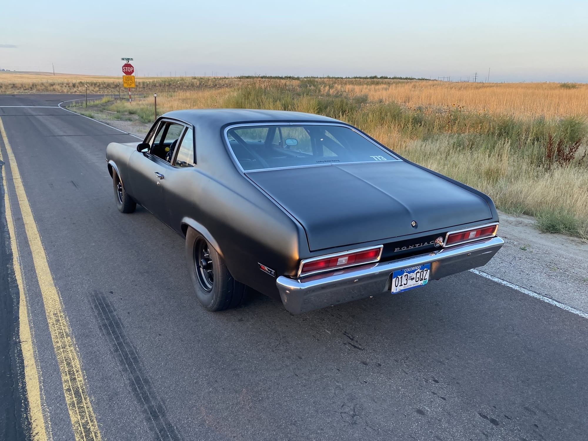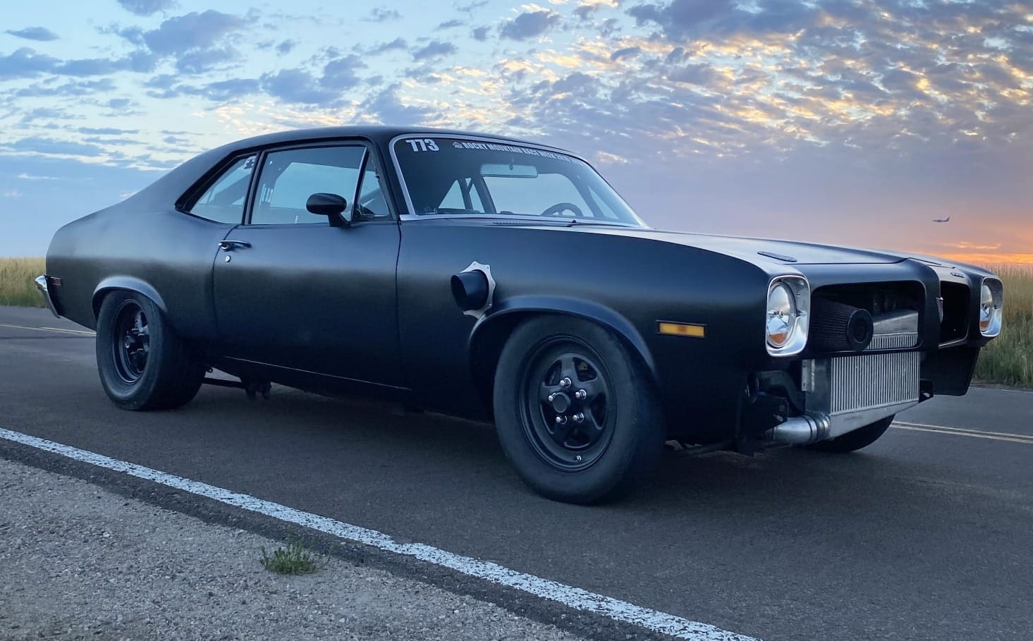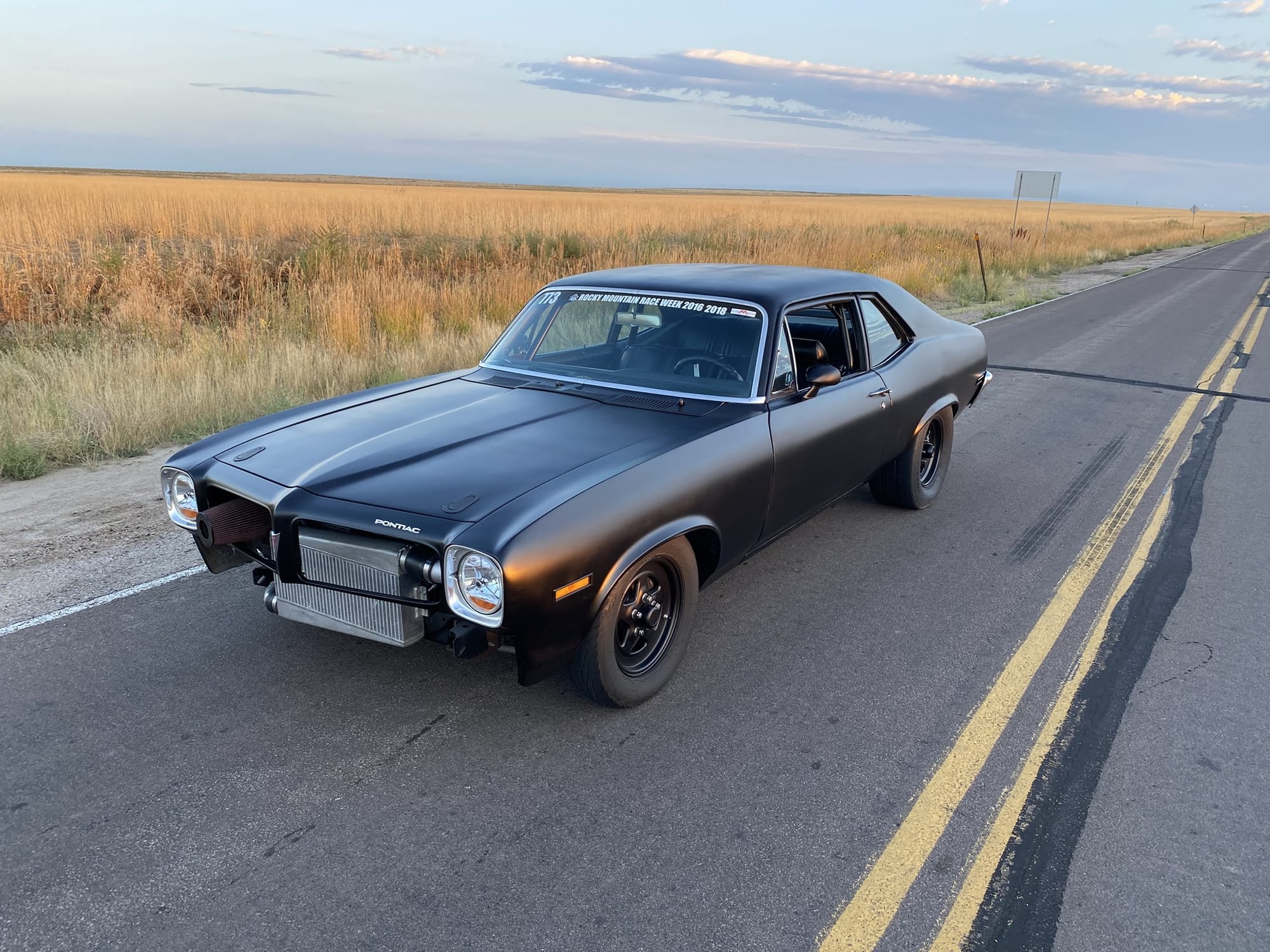 1972 Pontiac Ventura in Flat Black for sale! This is a true 8-second street car that was built for endurance drag racing, it's completed Rocky Mountain Race Week 4 times with no failures. The owner has put over 18K miles on the car with the Holley EFI and turbo LS setup. There's only 7K miles on the current forged 5.3L that's paired with a F.I S485 turbo, and mated to a SFI case TH400 transmission (recently built this past winter). It's also equipped with a pneumatic exhaust valve that blocks off the 5" fender exit and forces it through a single 2.5" exhaust over the axle to an OEM style muffler. This makes the car sound stock, and it's great for long drives. All upgrades (minus the chromoly 8.5 cage) were installed by the owner throughout his 15 years of ownership, and tuning was handled by him as well. The car was only on the dyno for initial tuning just to check everything, it made around 700whp on 16Ibs of boost. As for track times, it's ran a 5.7 in the 1/8-mile and an 8.9 @ 151mph in the 1/4-mile on a 26x8.5 pro bracket radial. The floor pans are very solid, there's a small amount of rust in the trunk pan, however all panels (fenders, doors, rockers) are solid. The owner painted the car flat black with Hotrod Flatz and it looks okay, there are some dry spots and imperfections. The quarter lips have some rust, but it's not horrible. If you want to put a nice gloss paint job on the car, the owner recommends repairing the rear wheel well lips or do half quarters. It's a great reliable street car, the owner just has another project, and he's going a different direction. Over $40K in parts alone! Clean title!