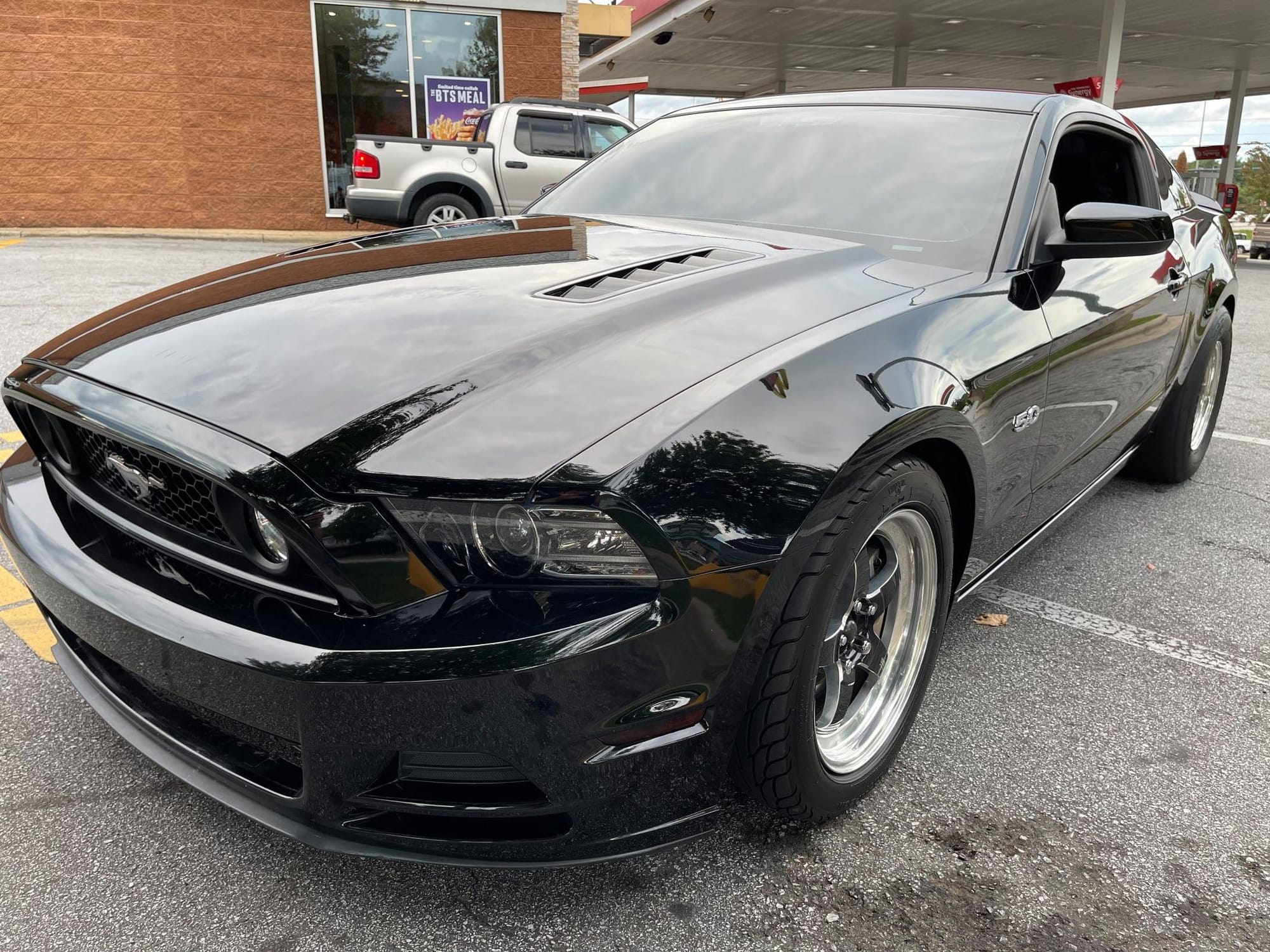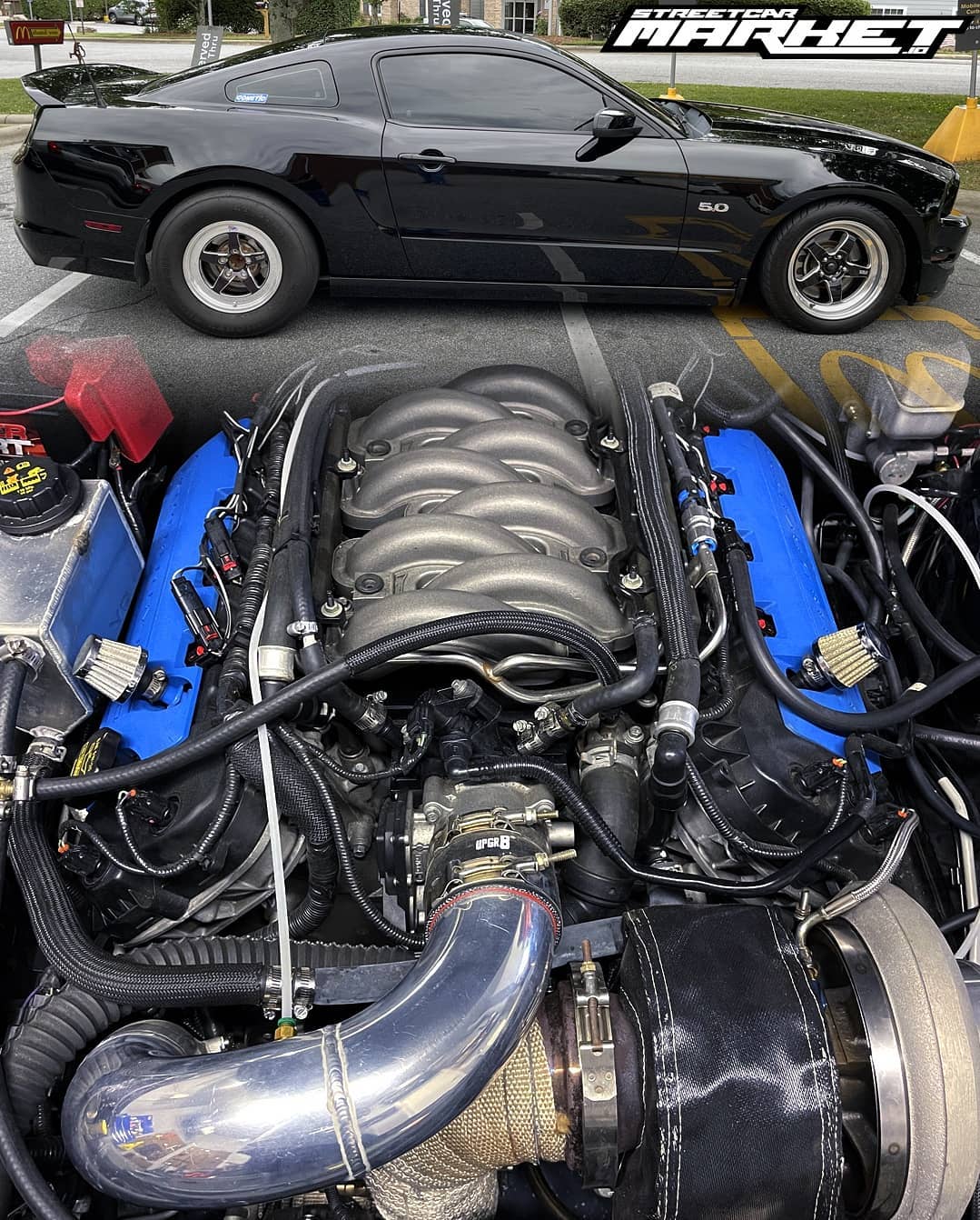 2013 Ford Mustang GT in Black with 51,308 miles for sale! This Mustang is powered by a gen I 5.0L Coyote that's paired with a Borg Warner 76/87 T6 turbo, and mated to a 6r80 6-speed automatic transmission. Additional upgrades include a 3400 Circle D stall converter, Sai Li return style fuel system, Injector Dynamics 1050cc fuel injectors, Boundary oil pump gears/crank sprocket, Weld Racing RT-S S71 wheels, and more. Tuning was handled remotely by Palm Beach Dyno, the car has not been on a dyno, however the owner estimates it's currently putting down 670-680whp with this setup. Boost is only set to 6Ibs, and it's never ran E85, only 93 octane. The owner notes this Turbo Mustang is in very nice condition, there is a minor scratch on the hood, and one small ding on the driver side that's the size of a dime. Cold A/C! Only 5,800 miles on the setup! Clean title!
