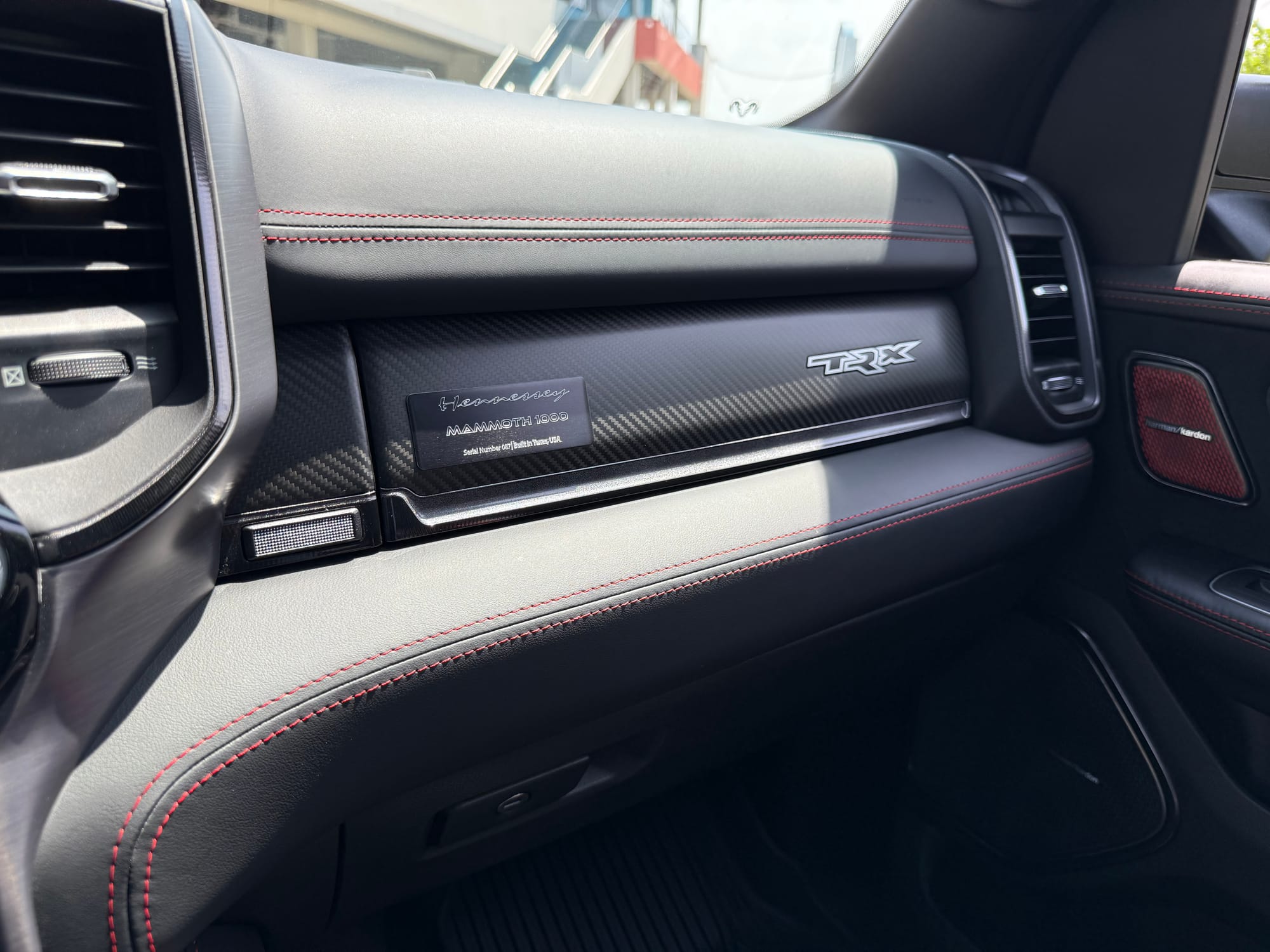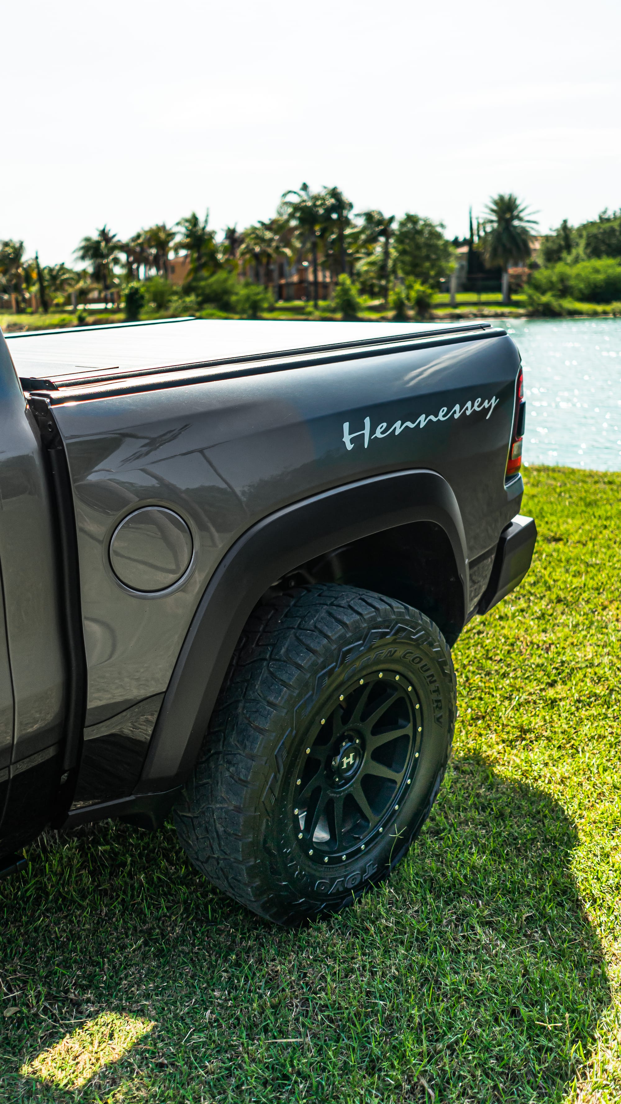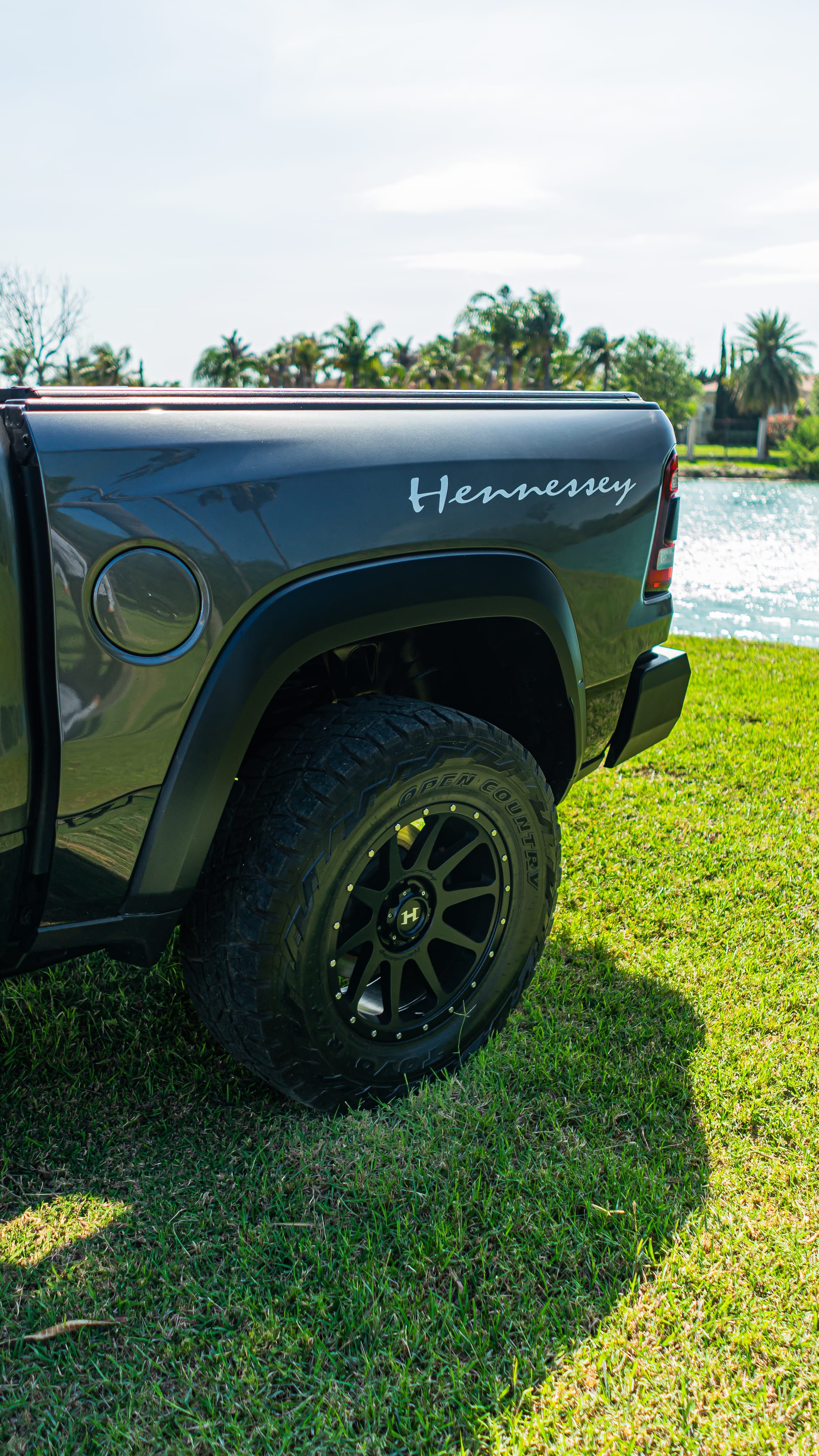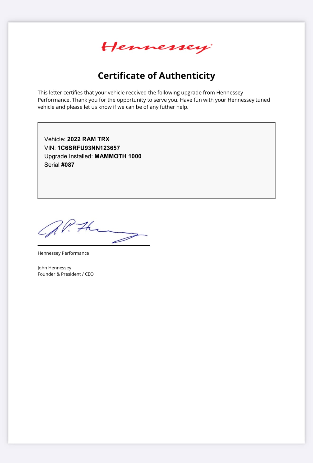 2022 Hennessey Mammoth 1000 Ram TRX in Granite Crystal with 38,158 miles for sale! Only 200 Ram TRX trucks were slated to receive the MAMMOTH 1000 package from Hennessey for the 2022 production year, this particular example is #087. Power comes courtesy of a 6.2L HEMI that’s topped with an upgraded 2.65L supercharger, and linked to an 8HP95 8-speed automatic transmission. Following the upgraded high-flow supercharger, the supercharger system utilizes pulley upgrades along with a heavy duty supercharger belt, and high-flow filtration system. Additional performance upgrades include a crank case ventilation system, crank damper pin assembly upgrade, high-flow fuel injectors, upgraded spark plugs, and an upgraded thermostat. This TRX was also outfitted with the MAMMOTH Off-Road Kit (Stage 2), which features MAMMOTH custom bumpers, 20” Hennessey wheels wrapped in 37” off-road tires, front leveling kit, electronic fold out steps, and Hennessey/MAMMOTH badging. Tuning was completed by Hennessey as well with their ECM/TCM calibration, resulting in an output of 765.63whp/737.17wtq on a Dynojet. All invoices/documentation from Hennessey will be included along with the dyno sheet. Clean title!