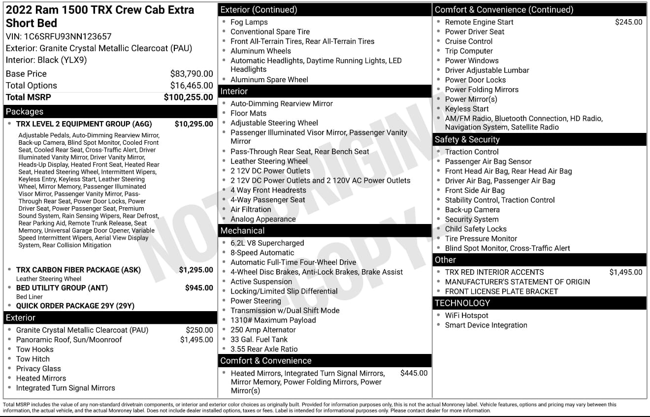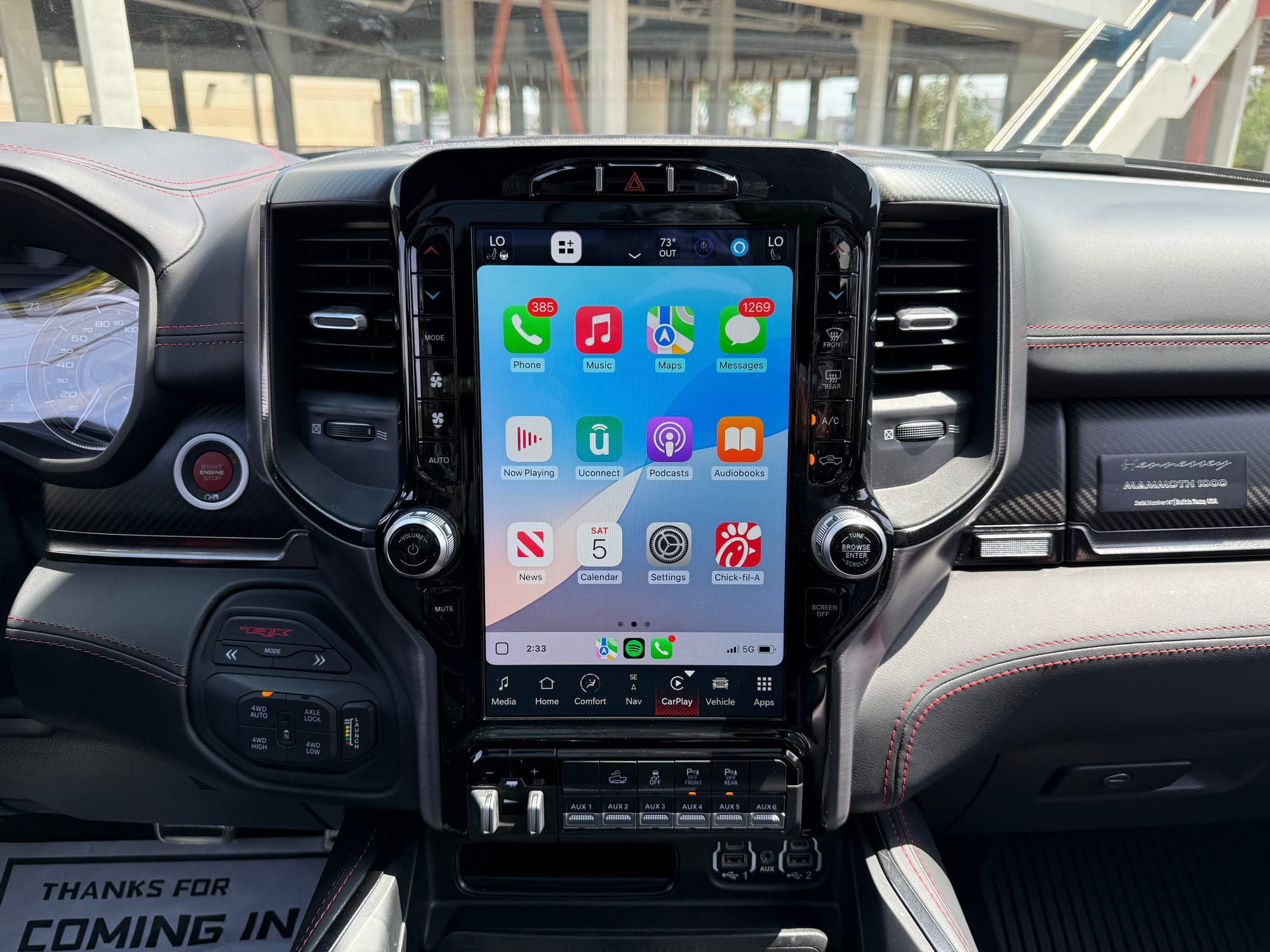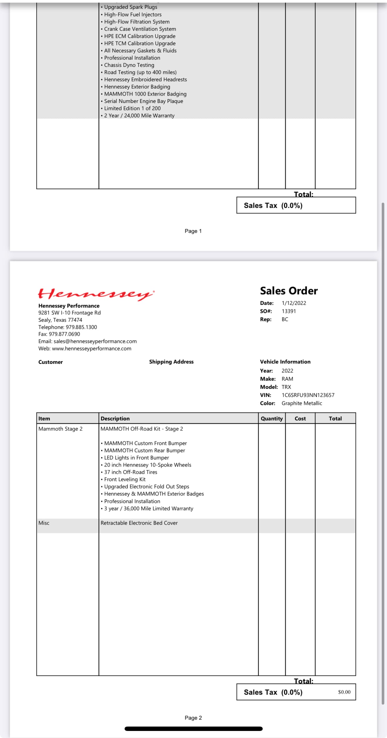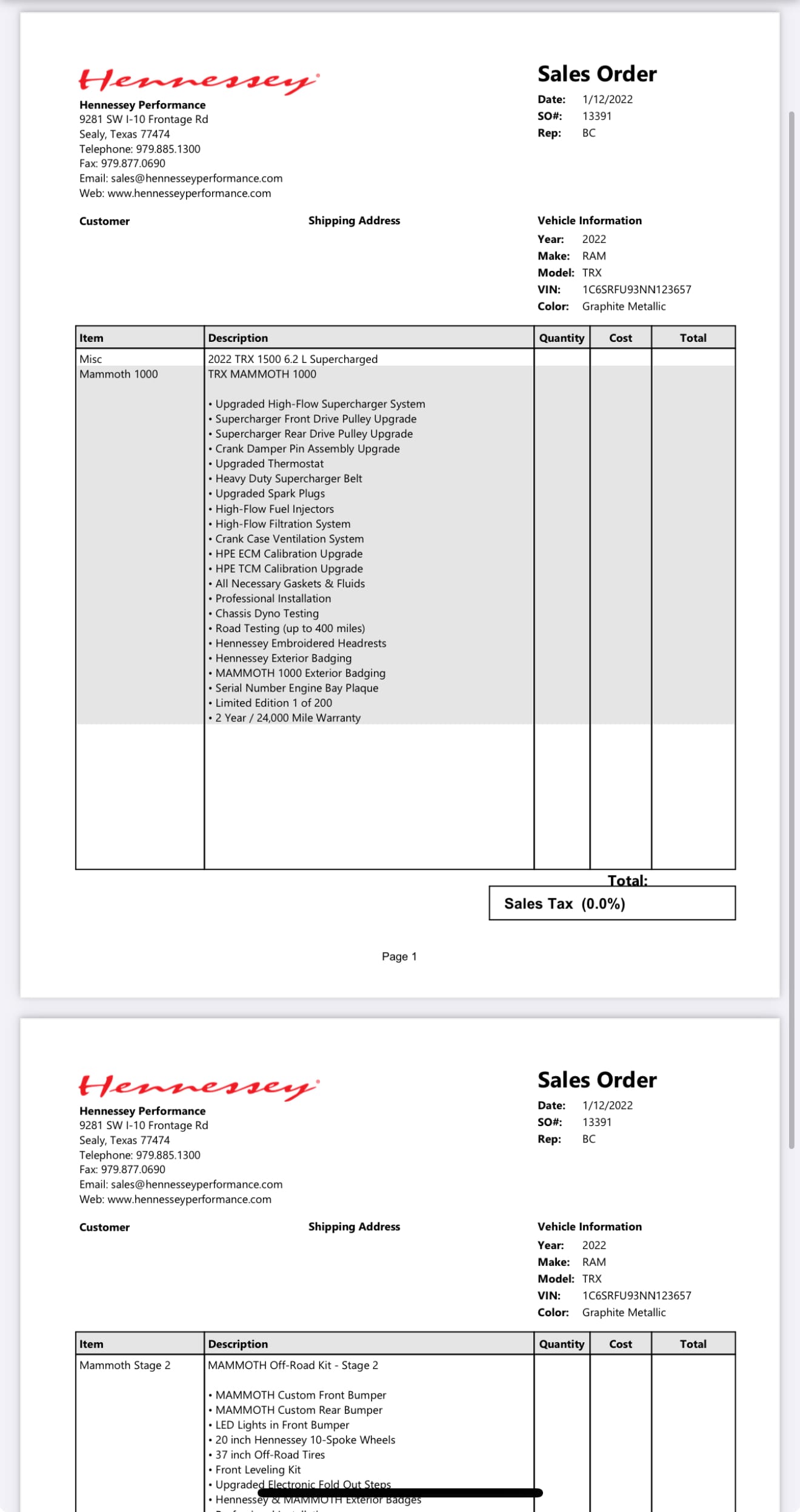 2022 Hennessey Mammoth 1000 Ram TRX in Granite Crystal with 38,158 miles for sale! Only 200 Ram TRX trucks were slated to receive the MAMMOTH 1000 package from Hennessey for the 2022 production year, this particular example is #087. Power comes courtesy of a 6.2L HEMI that’s topped with an upgraded 2.65L supercharger, and linked to an 8HP95 8-speed automatic transmission. Following the upgraded high-flow supercharger, the supercharger system utilizes pulley upgrades along with a heavy duty supercharger belt, and high-flow filtration system. Additional performance upgrades include a crank case ventilation system, crank damper pin assembly upgrade, high-flow fuel injectors, upgraded spark plugs, and an upgraded thermostat. This TRX was also outfitted with the MAMMOTH Off-Road Kit (Stage 2), which features MAMMOTH custom bumpers, 20” Hennessey wheels wrapped in 37” off-road tires, front leveling kit, electronic fold out steps, and Hennessey/MAMMOTH badging. Tuning was completed by Hennessey as well with their ECM/TCM calibration, resulting in an output of 765.63whp/737.17wtq on a Dynojet. All invoices/documentation from Hennessey will be included along with the dyno sheet. Clean title!