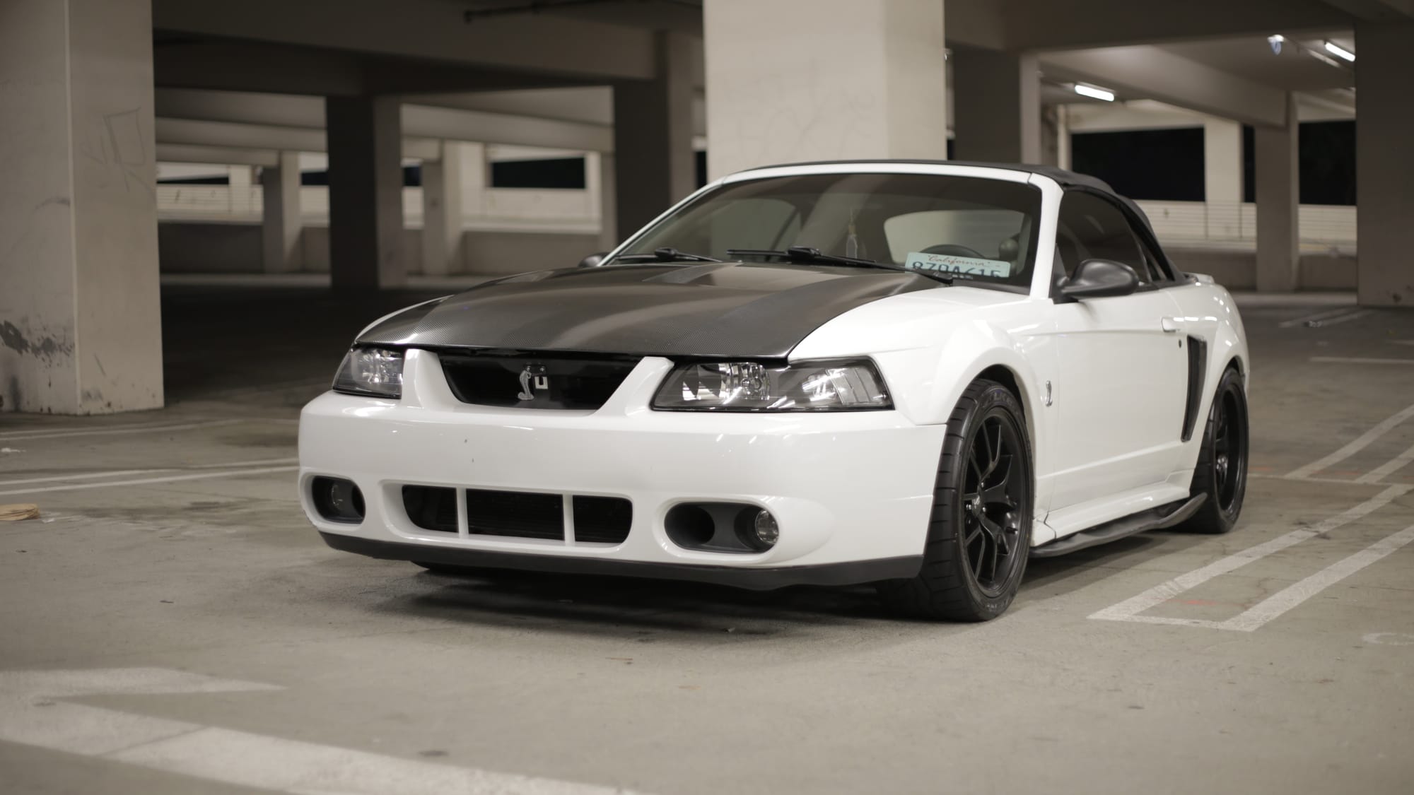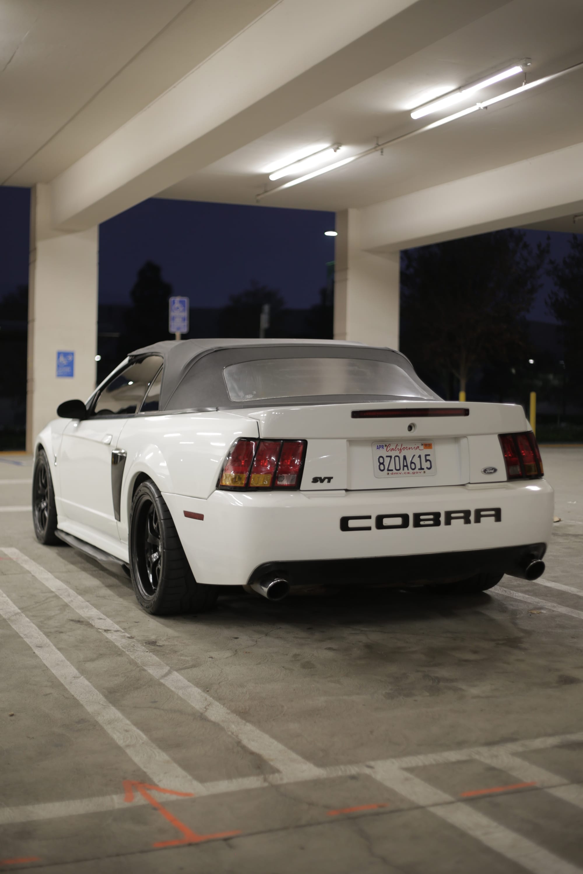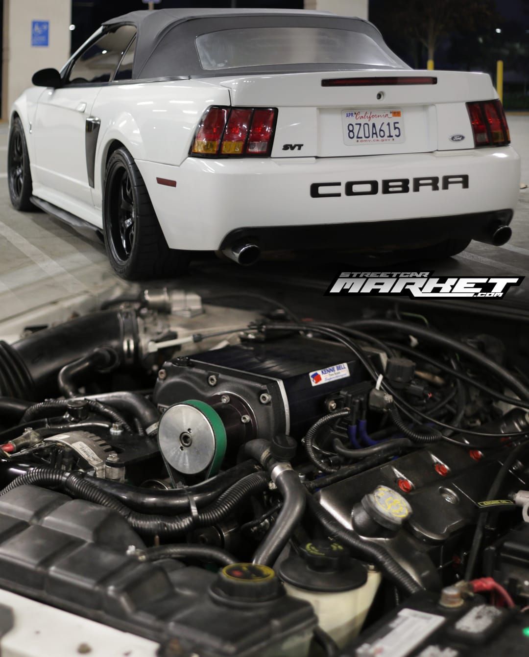473whp 1999 Ford Mustang SVT Cobra Convertible in Oxford White with 116,000 (Chassis) miles for sale! This Cobra is powered by a built engine with a 2.1L Kenne Bell supercharger atop, all backed by a 5-speed manual transmission that’s paired with a McLeod street clutch. The engine build begins with a Teksid block, which was fitted with Forged Manley rods, forged Mahle pistons, and a Forged Kellogg crankshaft to ensure the bottom end is solid. The engine also features a pair of ported heads, MMR head gaskets, ARP hardware, new spark plugs/oil pump, and MSD coil packs. Further equipped with a Kenne Bell Boost-A-Pump, Kooks long tube headers/off-road x-pipe, Borla Stinger catback, 3.73 gears, drilled and slotted rotors, Xtreme pads, and more. The radiator was pulled and sent out to be pressure tested and cleaned, resulting in maximum coolant flow. All cooling lines were flushed, and the engine was pulled/cleaned as well. All work was done by VJs Autocare, and tuning was completed by Greg Racers Edge in Downey, CA with an output of 473whp/407wtq. The car runs perfect, oil changes were performed every 2K miles. There are currently 17K miles on the engine build and 7K miles on the transmission. Receipts are available! Clean title!