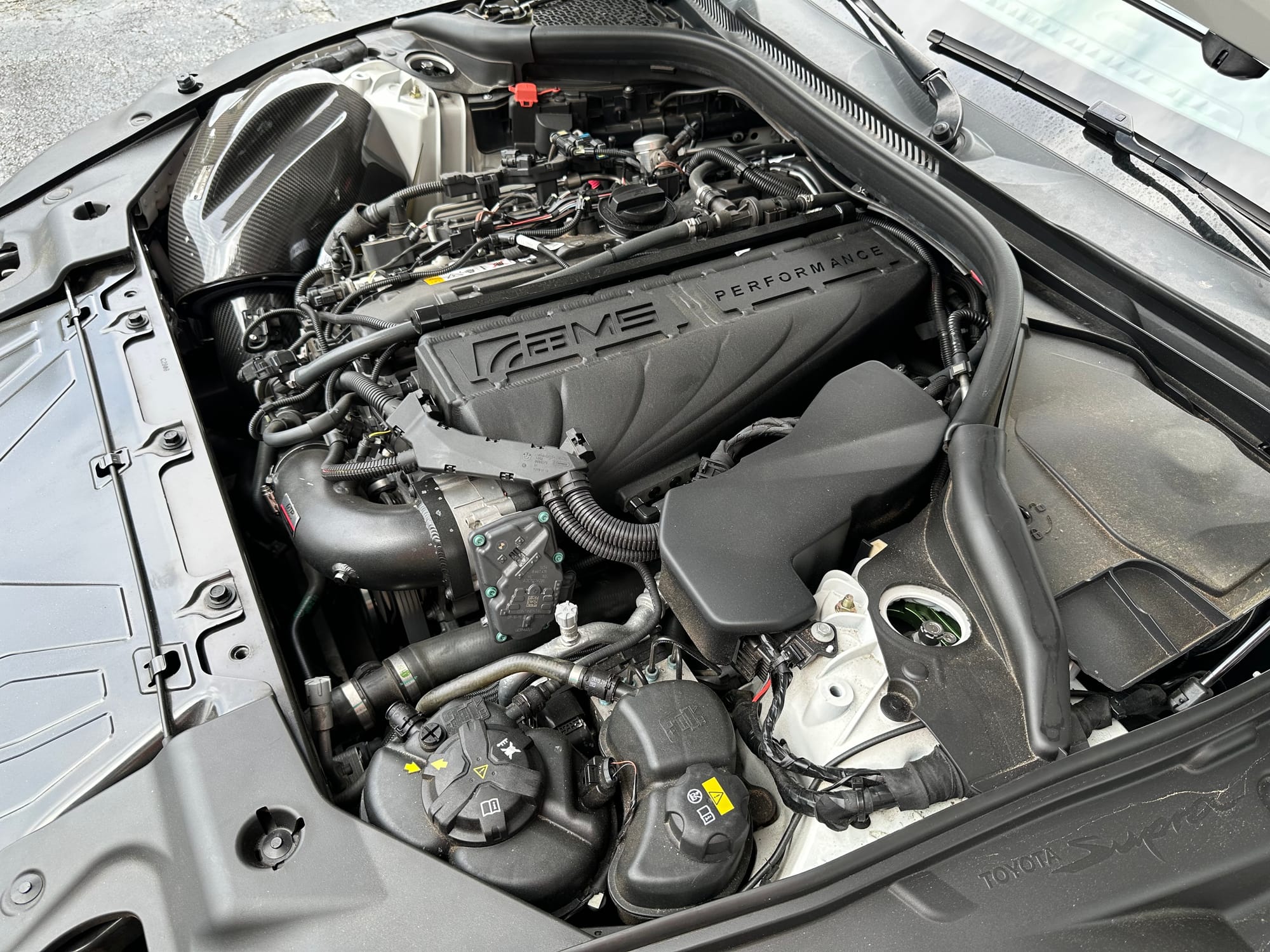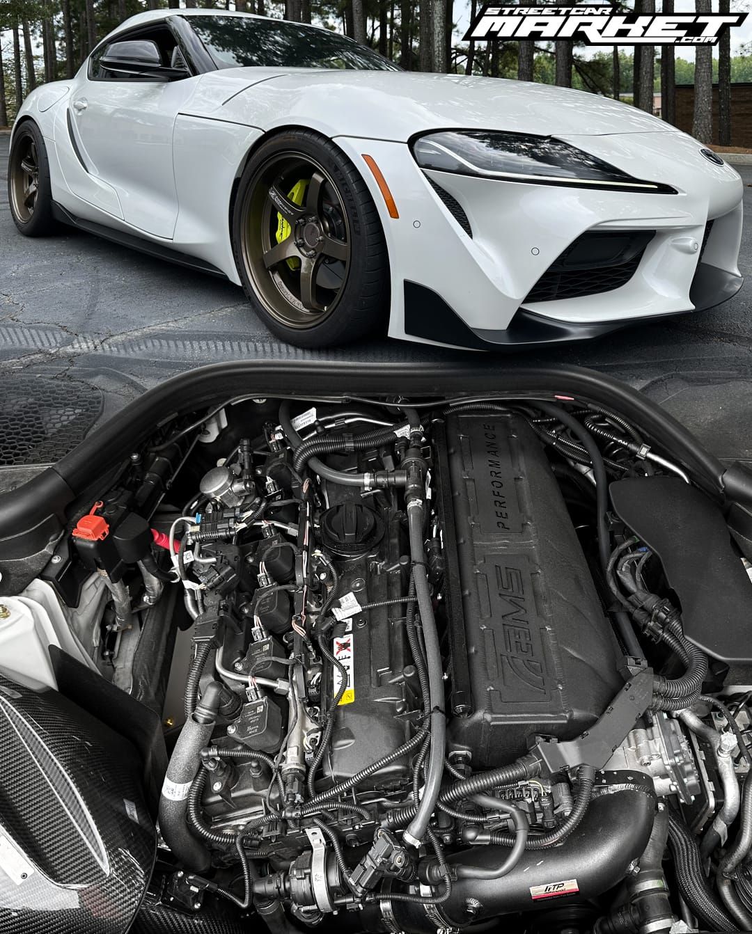 540whp 2020 Toyota GR Supra 3.0 in Absolute Zero with 26,028 miles for sale! Powered by a turbocharged 3.0L B58 that’s mated to an 8HP51 8-speed automatic transmission. The B58 also features an AMS intake manifold along with an FTP charge pipe, and Eventuri carbon fiber intake. Additional performance-related modifications include a Visconti flex fuel kit, Titan Motorsports downpipe, Akrapovic mid-pipe/axle-back (full titanium), CSF heat exchanger, and Koyo side radiators. In terms of suspension, the car is equipped with custom Fortune Auto 500 coilovers with Hyperco springs, Cusco front strut bar, and a handful of SPL components. All modifications were installed by the current owner who is a Master Tech at a Chrysler Dodge Jeep Ram (CDJR) dealership, and tuning was completed via EcuTek by Visconti on E50 and 93 octane with an output of 540whp/645wtq. The factory Absolute Zero paint shows incredibly well as the car was topped with Gtechniq CSL EXO ceramic coat, and the front end was further protected with clear bra. The owner has receipts for most of the modifications, and can print all if needed!