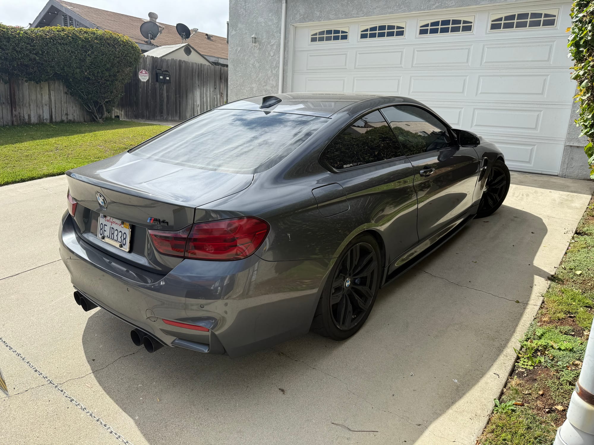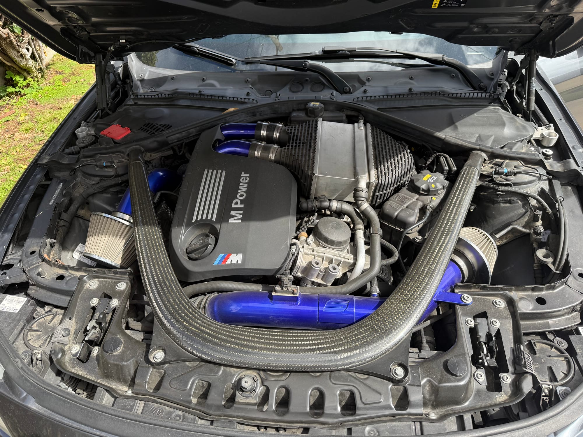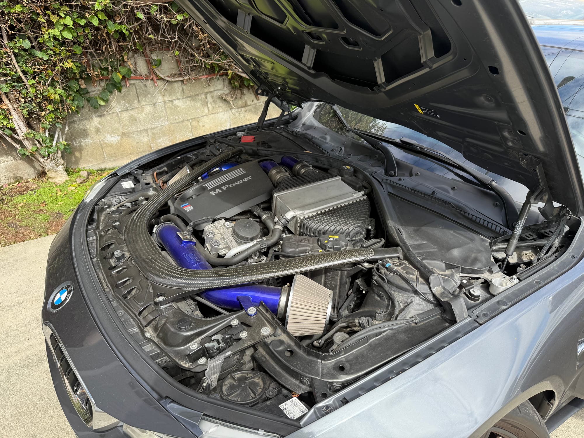 567whp 2015 BMW M4 in Mineral Grey with 60,800 miles for sale! This F82 M4 was modified by SSR Performance with receipts/invoices for all of the work performed. Beginning with the twin-turbocharged 3.0L S55 inline-six, which features the keyed 4-pin crank hub upgrade along dual cone high flow intakes and a charge pipe upgrade kit, both finished in custom Royal Blue. The current exhaust configuration consists of a custom 3” stainless steel exhaust pipe upgrade, and a Dinan cat-back with black tips. Further equipped with upgraded spark plugs for the E85 tune (gapped to 0.018”), and an eMMOTION lowering spring kit. Tuning was completed by SSR Performance with a custom E85 dyno tune (Stage 2) as well with an output of 567whp/621wtq. The owner just had a baby, so unfortunately the car just sits in the garage, there are zero issues other than a small scuff that’s located on the lower right side of the front bumper. Clean title!