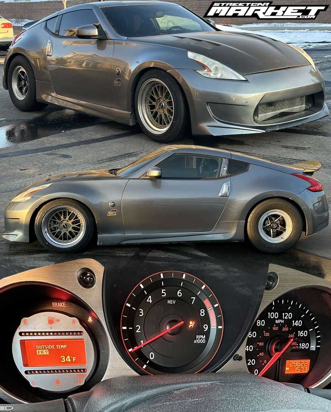 600+whp 2012 Nissan 370Z in Gun Metallic with 28,000 miles for sale! This 370Z is powered by a recently installed used stock 3.7L VQ37VHR V6 that’s paired with a Fast Intentions Stage 3 twin turbo kit (Xona 3579 turbos), and mated to a 6-speed manual transmission with a Stage 3 single clutch. This setup is fueled by an AAM dual pump fuel system, which features a pair of Walbro 450LPH fuel pumps. Further equipped with a Fast Intentions full 3” exhaust system, Mishimoto aluminum radiator, Setrab 34-row oil cooler, and a rear pair of 15” WELD Racing RT-S S71 wheels wrapped in Mickey Thompsons to assist with traction. Modifications were installed by Specialty Z, and tuning was handled by them as well via EcuTek (latest version) with anti-lag and 4 custom maps ranging from 500whp to 600+whp. The car does carry a rebuilt title, however the vehicle is in good condition with no mechanical issues. There are some minor dings and scratches, consistent with age. Invoices are available!