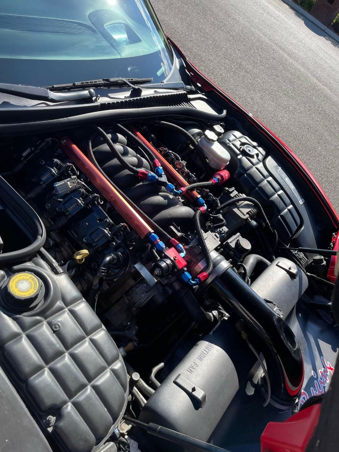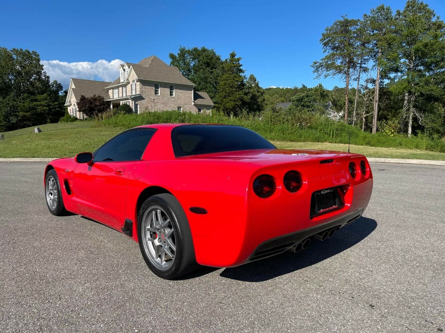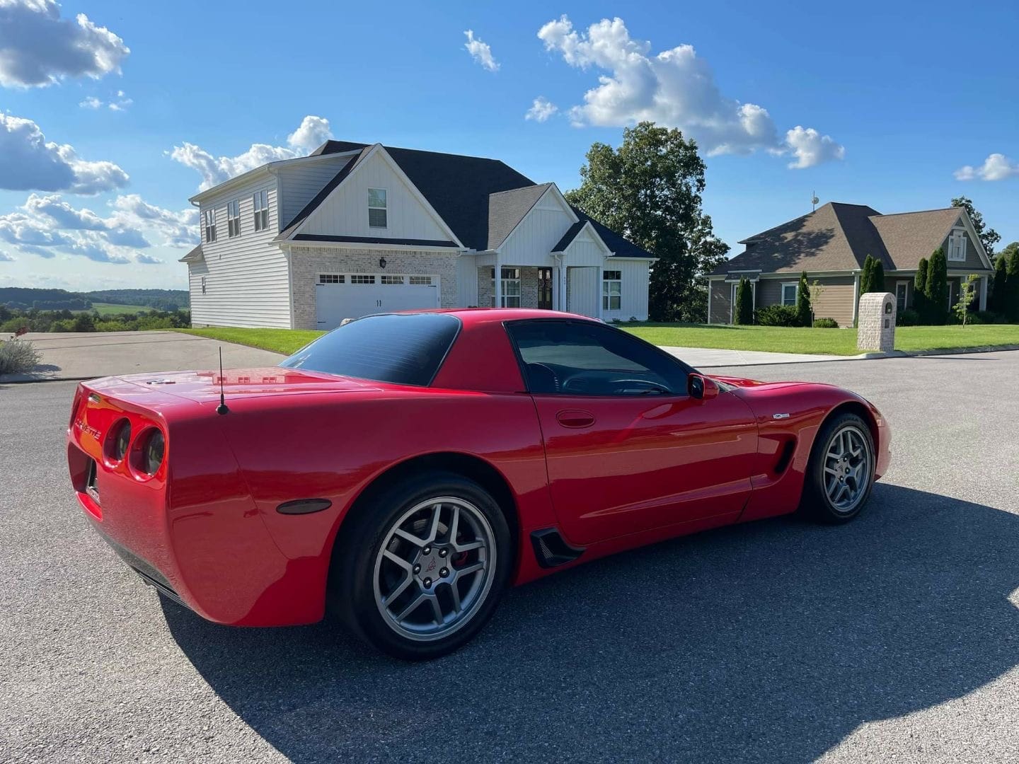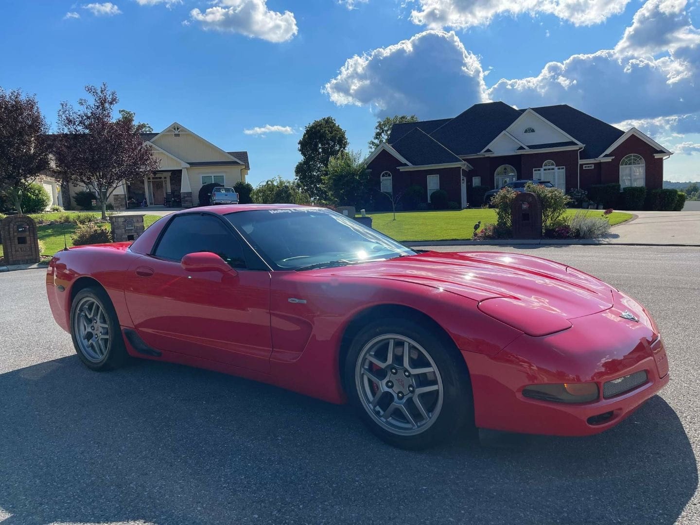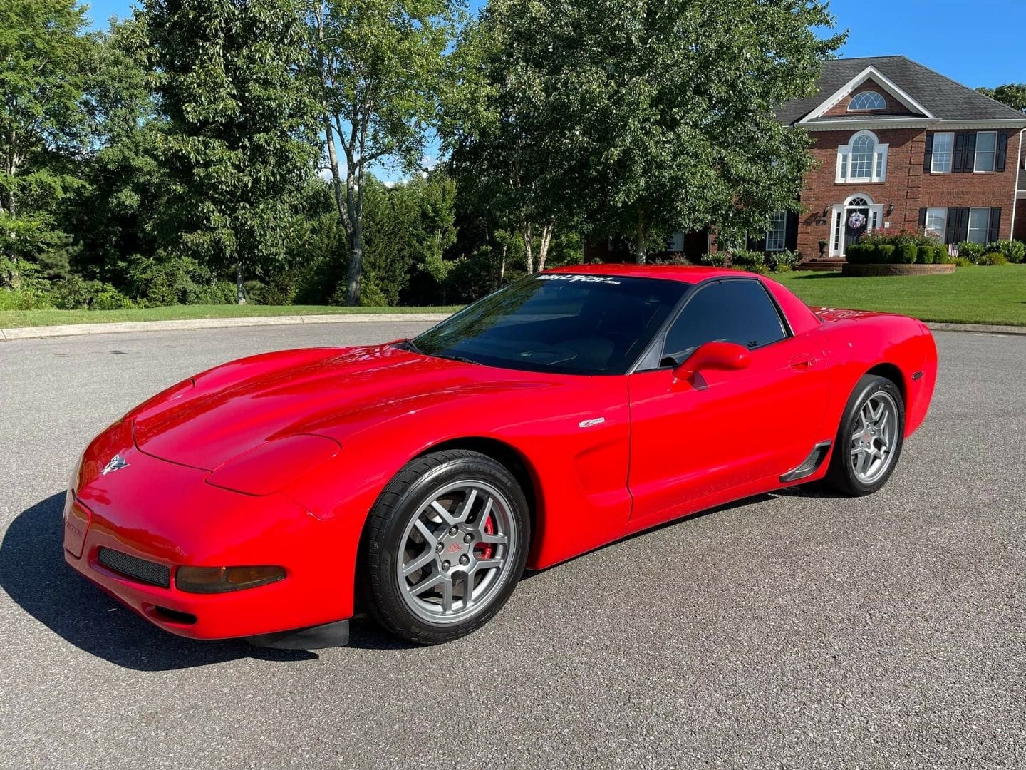 725whp 2003 Chevrolet Corvette Z06 in Torch Red with 39,100 (Chassis) miles for sale! This clean C5Z rocks a built LS6 with a UPP twin turbo kit that utilizes a front mount intercooler and 57mm Garrett turbos. More specifically, the engine build features Eagle H-beam rods, Mahle forged pistons, ARP main/head studs, ported 243 heads, COMP turbo camshaft, BTR .660” dual valve springs/hardened pushrods, and several more components. Fueling this setup is an Aeromotive in-tank A1000 fuel pump along with fuel rails, regulator, and Siemens 80Ib fuel injectors (recently cleaned & flowed). This build houses the factory T-56 6-speed manual transmission with a McLeod twin disc clutch, followed by a RPM level 4 rear differential, and rear differential brace. Additional upgrades include electronic cutouts, ceramic coated hot side piping, eBoost2 boost electronic boost controller, DeWitts radiator/fan setup, Alky Control methanol injection system, short throw shifter, and new 315/30/18 Hoosier DR2 rear tires. This twin turbo C5Z was built by the previous owner, and tuned by Dynospeed with an enhanced output of 725whp on 12Ibs of boost and 93 octane. The complete engine build sheet will be included along with the dyno sheet! Only 7K miles on the build! Clean title!