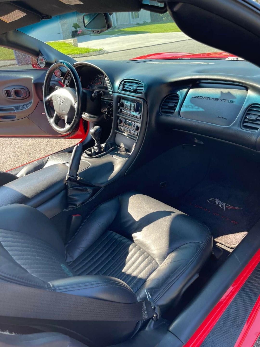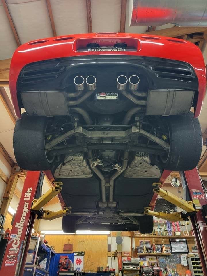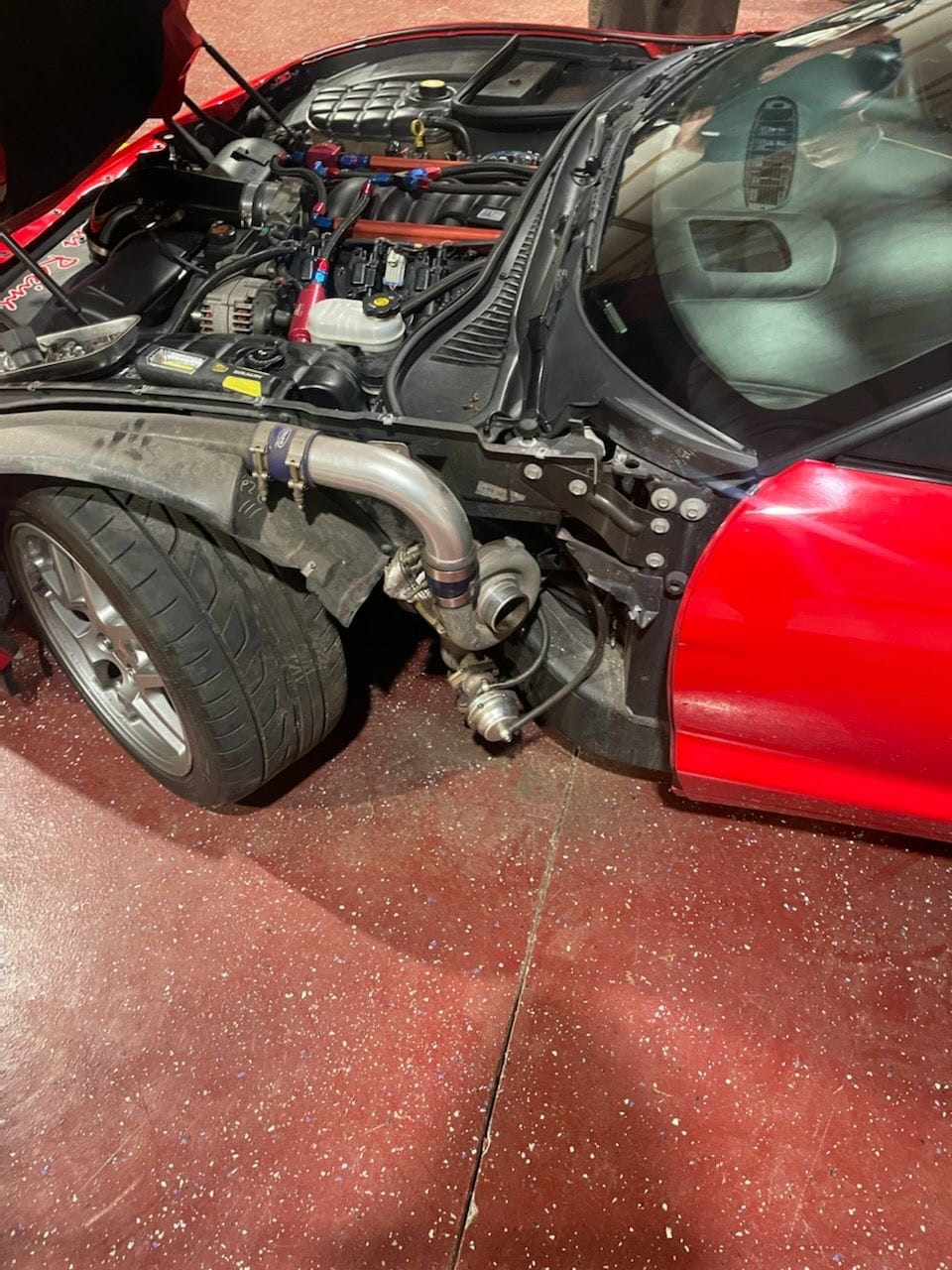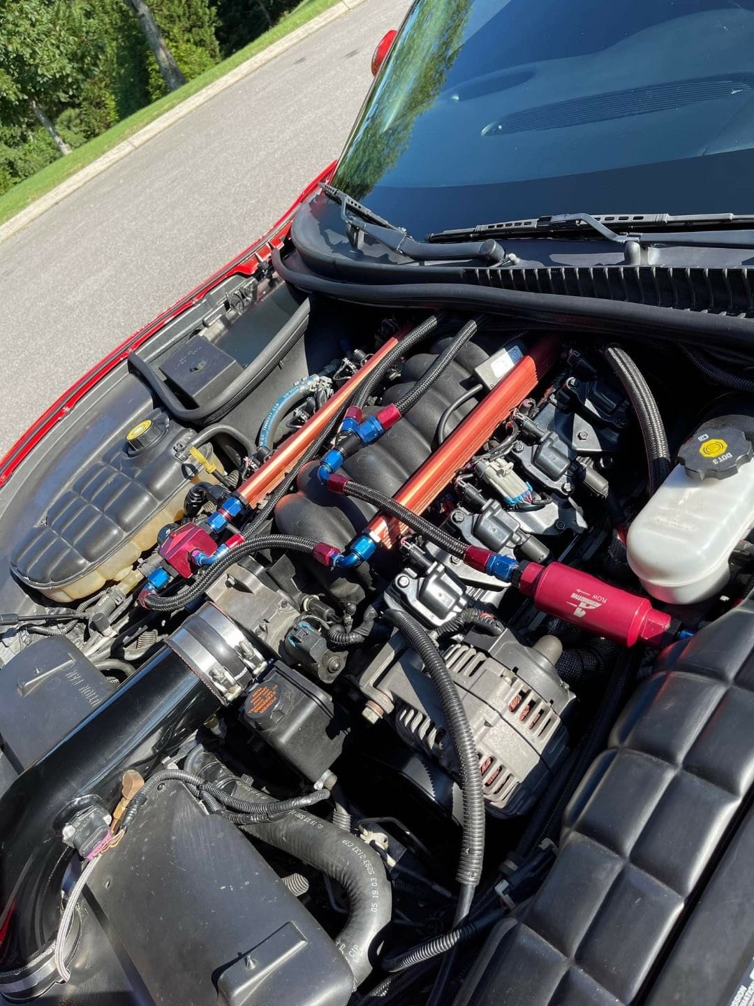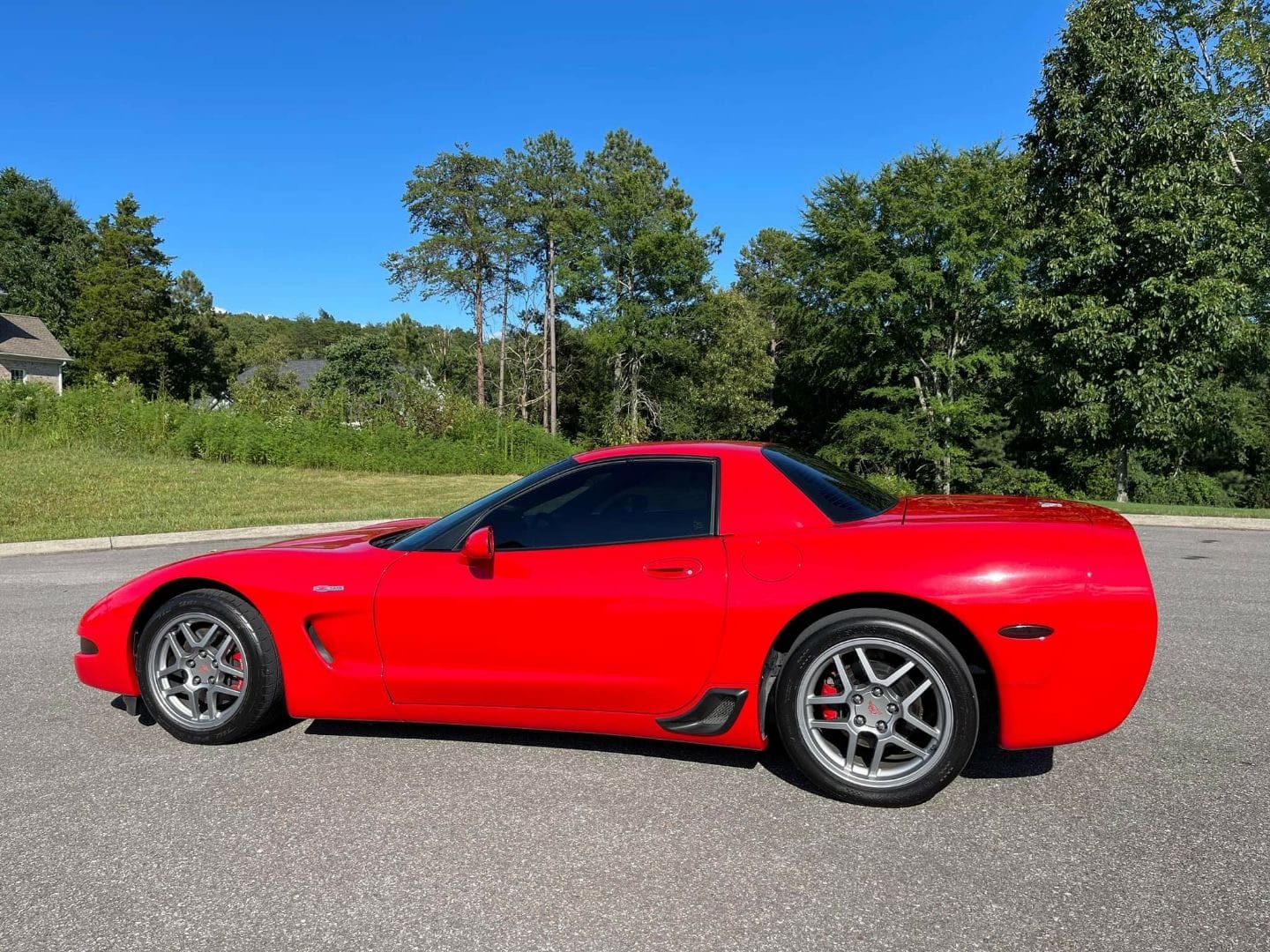 725whp 2003 Chevrolet Corvette Z06 in Torch Red with 39,100 (Chassis) miles for sale! This clean C5Z rocks a built LS6 with a UPP twin turbo kit that utilizes a front mount intercooler and 57mm Garrett turbos. More specifically, the engine build features Eagle H-beam rods, Mahle forged pistons, ARP main/head studs, ported 243 heads, COMP turbo camshaft, BTR .660” dual valve springs/hardened pushrods, and several more components. Fueling this setup is an Aeromotive in-tank A1000 fuel pump along with fuel rails, regulator, and Siemens 80Ib fuel injectors (recently cleaned & flowed). This build houses the factory T-56 6-speed manual transmission with a McLeod twin disc clutch, followed by a RPM level 4 rear differential, and rear differential brace. Additional upgrades include electronic cutouts, ceramic coated hot side piping, eBoost2 boost electronic boost controller, DeWitts radiator/fan setup, Alky Control methanol injection system, short throw shifter, and new 315/30/18 Hoosier DR2 rear tires. This twin turbo C5Z was built by the previous owner, and tuned by Dynospeed with an enhanced output of 725whp on 12Ibs of boost and 93 octane. The complete engine build sheet will be included along with the dyno sheet! Only 7K miles on the build! Clean title!