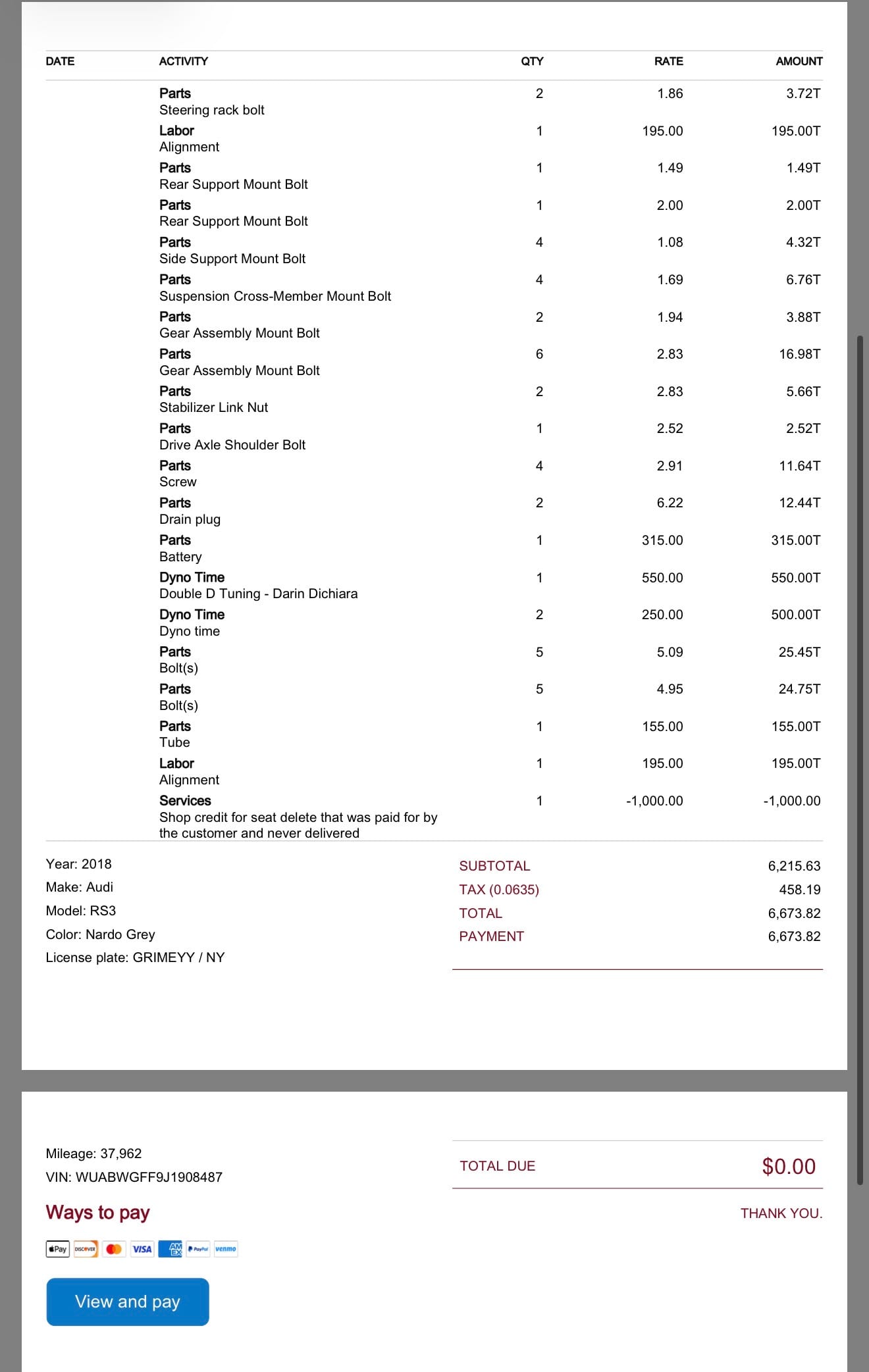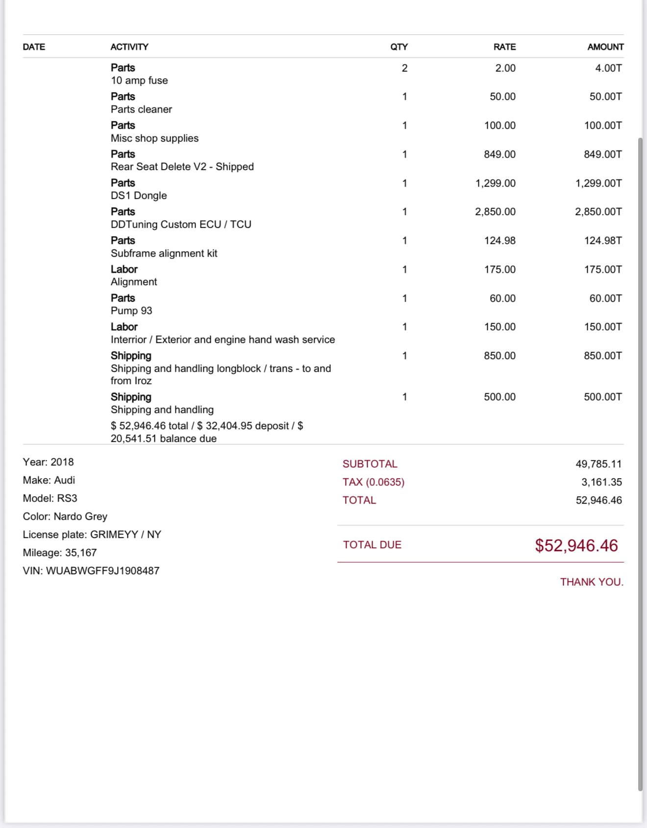 820+whp 2018 Audi RS3 in Nardo Gray with 38,396 (Chassis) miles for sale! This 8V RS3 is the perfect sleeper, packing solid power with a reliable tune. The owner had the car built with the intention of keeping it, so absolutely no corners were cut with over $50K in mod work and high-quality components throughout. It was purchased completely stock in 2022, and was later modified by The Shop CT with invoices for all of the major work performed. Power comes courtesy of an IMS Stage 2 built engine (installed at 35K miles) that’s matched with a recently installed full frame IMS 950R turbo kit from IROZ, so the new owner will be getting this build with a completely fresh full frame setup that has little to no miles on it. Power generated from this combo is transferred to the Quattro all-wheel-drive system through a 7-speed dual-clutch transmission with a Deka HD1300 clutch kit. Fuel demands were met with SRM upgraded fueling (flex), followed by a set of ID1700-XDS port injectors, IMS fuel line upgrade kit, and an IMS billet fuel rail. Additional upgrades include an IMS 1150HP intercooler, IMS charge pipe kit, Bull-X valved exhaust, bTres DS1 monitor, IROZ guibo reinforcement, JXB driveshaft center support bearing carrier upgrade, 034Motorsport sway bars, GiroDisc 2PC rotors, and more. All brought together with DS1 ECU/TCU tuning by Darin (DoubleD Race and Tuning) with an output of 820whp/703wtq (safe tune), the car has more in it if needed, but the owner wasn’t chasing numbers. The car was daily driven for a period, so it shows typical wear consistent with mileage, but remains in great condition overall with no major performance or cosmetic issues. The Insta360 video was on the previous Hybrid TTE777 setup (used from 35-38K miles), there are no videos of the new setup as it was just recently completed. As mentioned, the build was never intended to be sold, but priorities have shifted. It has always performed flawlessly, the next owner will not be disappointed! Only 3K miles on the build! Recently fully serviced! Clean title and Carfax!