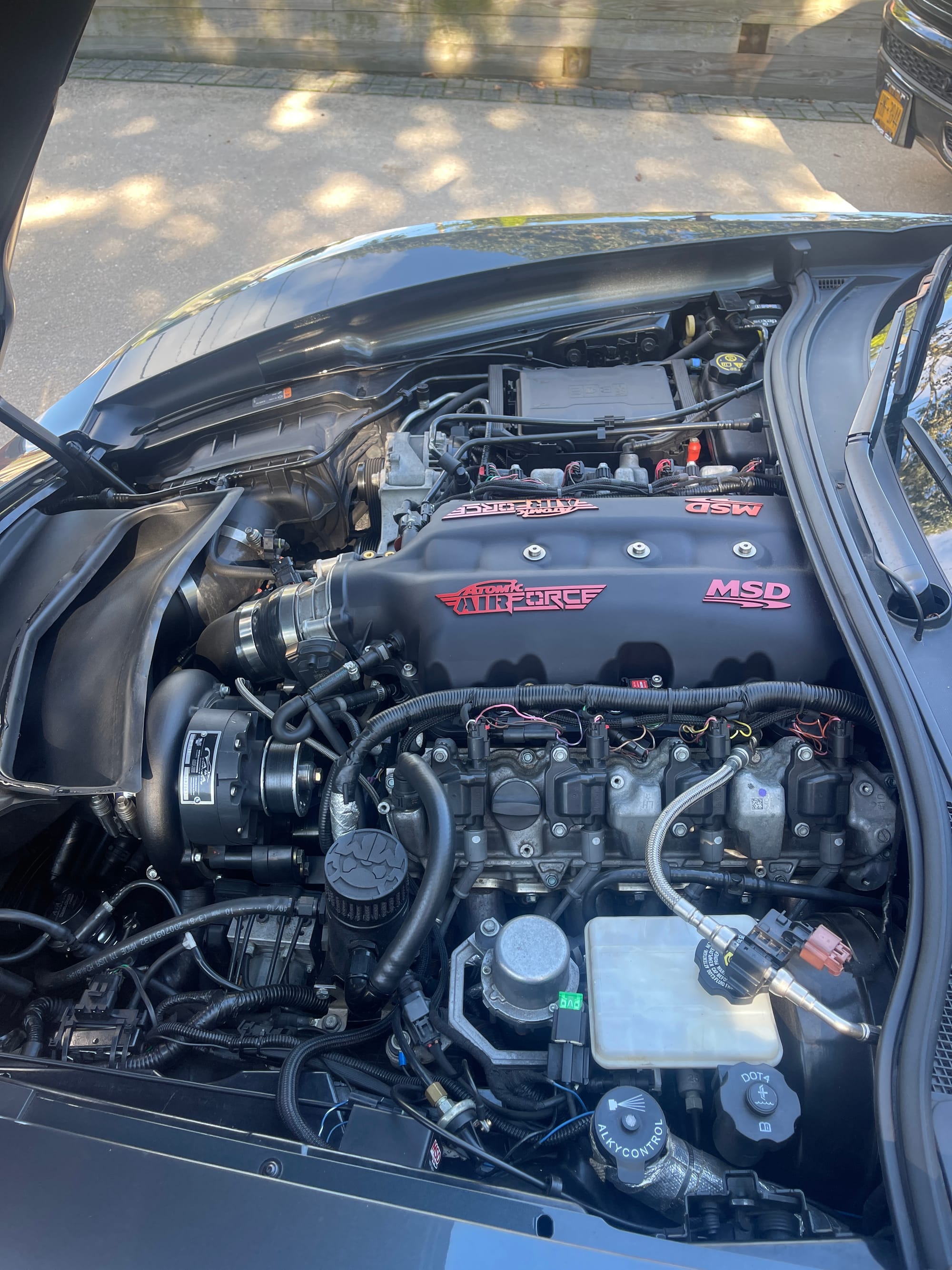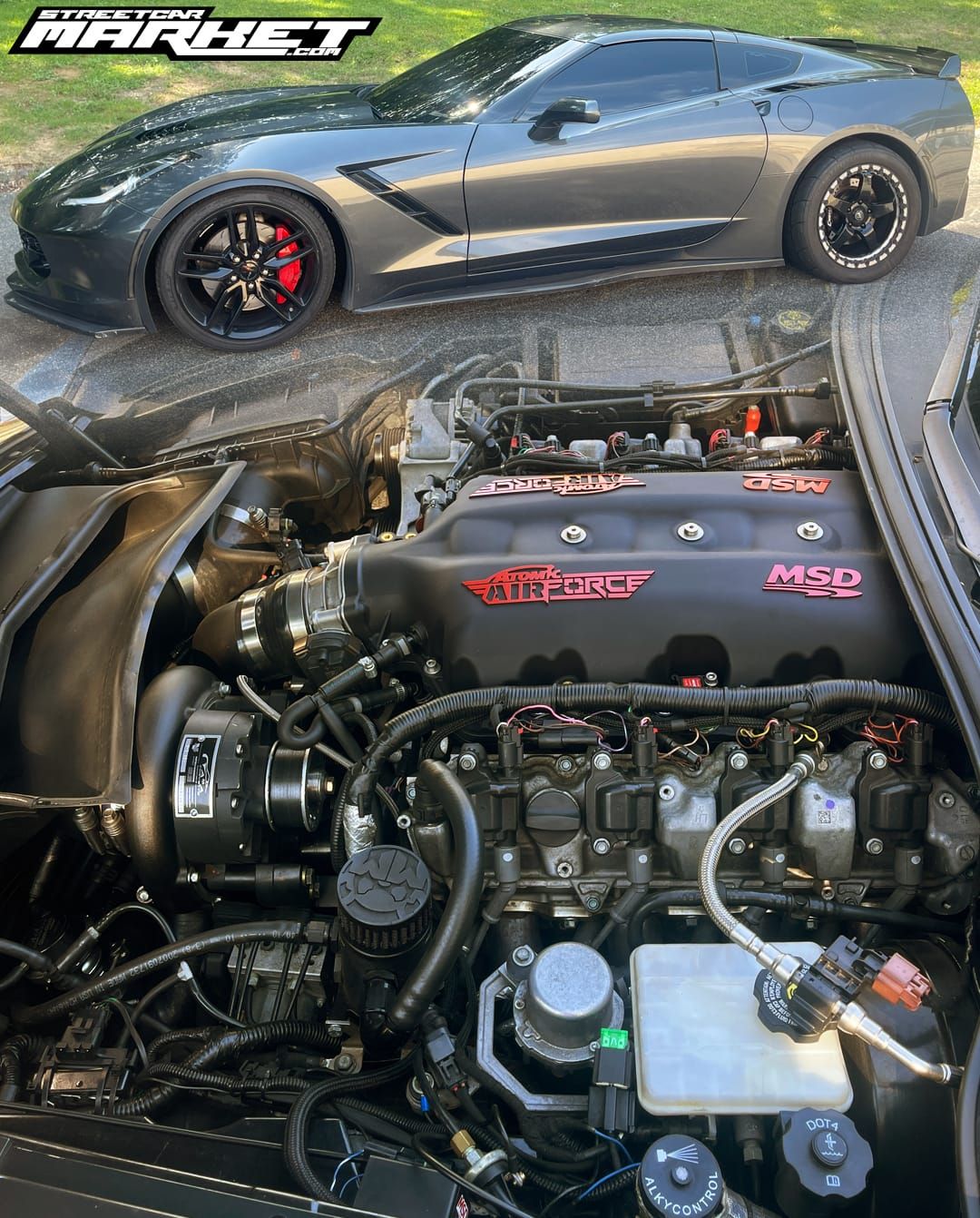 870whp 2018 Chevrolet Corvette Stingray 2LT in Watkins Glen Gray with 28,000 miles for sale! This C7 packs a built LT1 that’s paired with an A&A YSi supercharger, a solid combination that’s kicking out a startling 870whp. The LT1’s bottom end was strengthened with the installation of Texas Speed pistons and rods, followed by a handful of top end upgrades. The fuel system consists of a LT4 HPFP, DSX low side, flex fuel sensor, and a set of LT4 fuel injectors. The drivetrain has been upgraded as well, beginning with the factory Tremec TR-6070 7-speed manual transmission which was matched with a McLeod RXT twin disc clutch/steel flywheel, followed by a DSS aluminum driveshaft/axles. Additional key components include 2” American Racing headers, Borla S-Type exhaust, Alky Control dual nozzle methanol injection kit, Carlyle Racing 17” conversion, and several aesthetic upgrades. Modifications were installed by Petrolwerks, and tuning was handled by JTM Motorsports. All stock parts will be included as well! There are currently around 7K miles on the build with receipts for the work that was performed! Clean title!