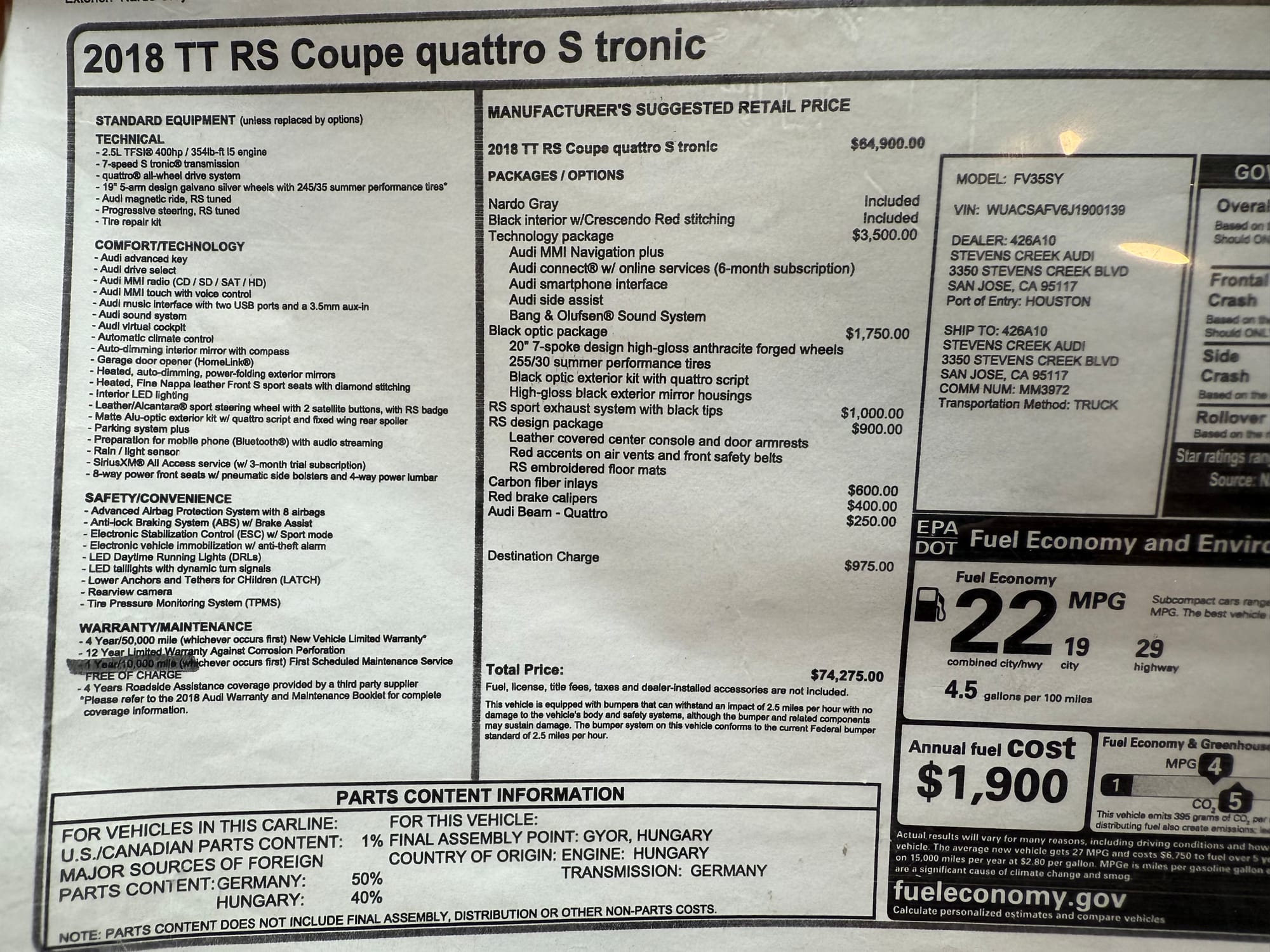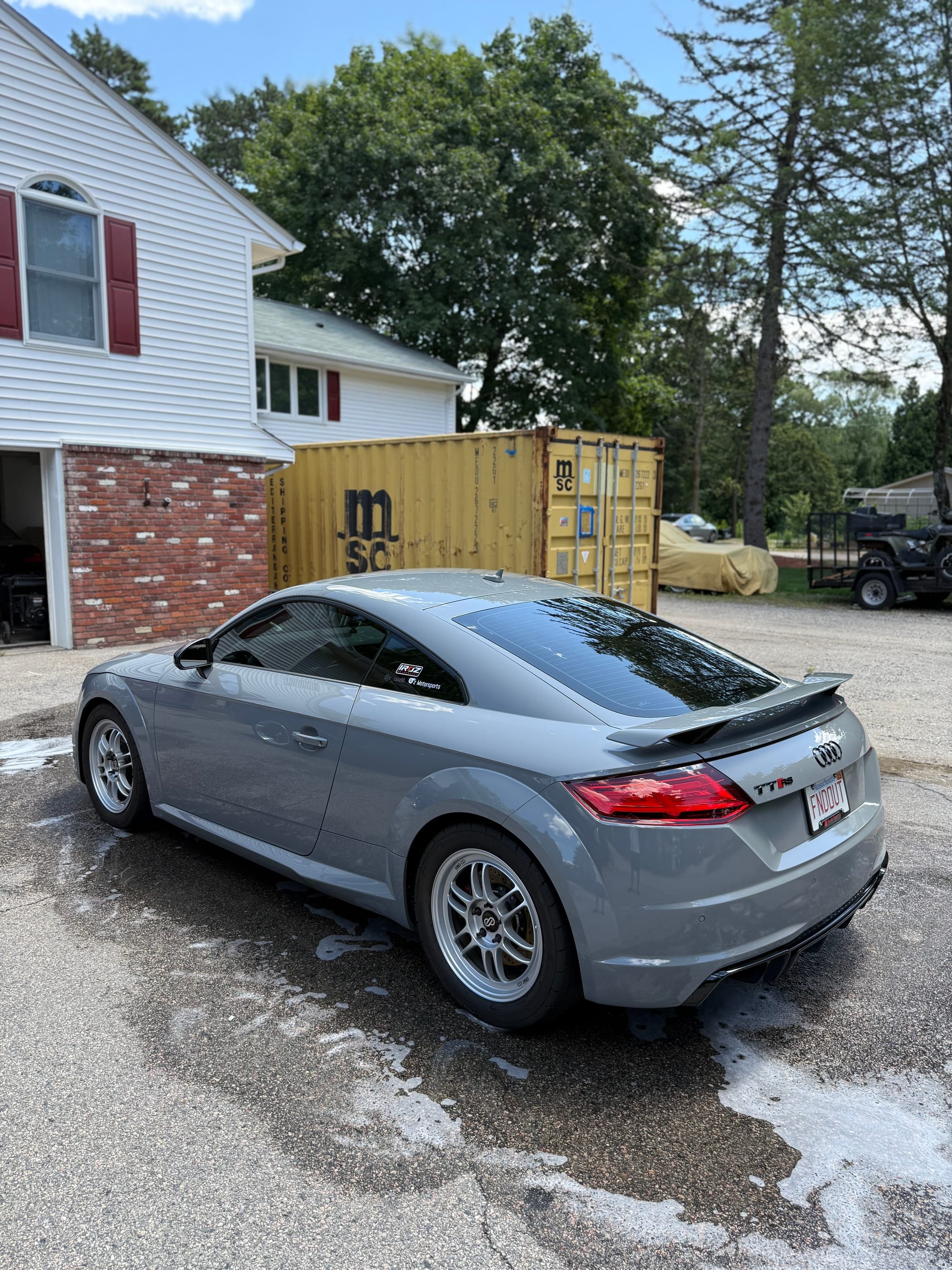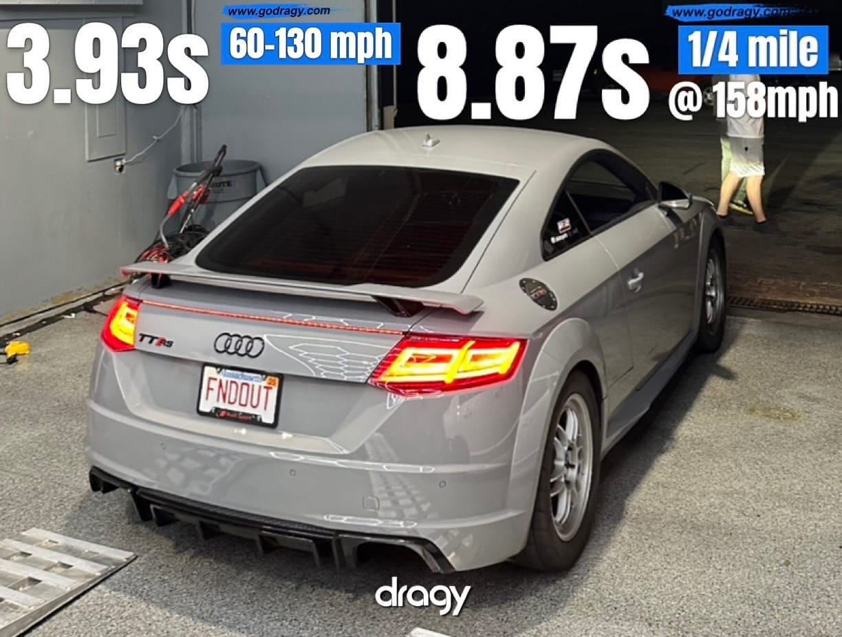 875whp 2018 Audi TT RS in Nardo Gray with 31,000 (Chassis) miles for sale! The heart of this TT RS consists of an IROZ Motorsport built engine that’s paired with an IMS850 turbo kit (Xona 8267), power generated from this combination is transferred to the Quattro all-wheel-drive system through an IROZ Motorsport built 7-speed dual-clutch transmission. This build was completed by OZ Motorsports, featuring a plethora of modifications, all areas were addressed, including the engine, drivetrain, fuel system, suspension, weight reduction, etc. All brought together with DS1 custom ECU/TCU/Haldex tuning from Darin Dichiara/Double D Tuning with an output of 875whp/738wtq on the dyno. As for performance metrics, the car went 60-130 in 3.9s and ran an 8.8 @ 158.5mph in the 1/4-mile on a non-prepped street via Dragy. On the scales, the car weighed 2,780Ibs in race configuration. There are currently 10K miles on the build with invoices for the work performed! Clean title!