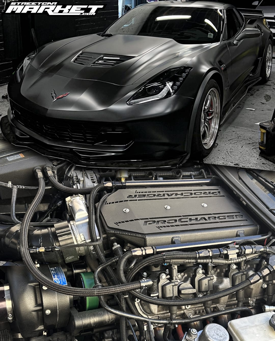 980whp 2015 Chevrolet Corvette Z06 2LZ in Watkins Glen Gray (Wrapped in Satin Black) with 29,650 miles for sale! This menacing C7Z packs a cammed 6.2L LT4 that’s matched with an F1A-94 ProCharger, and linked to an 8L90 8-speed automatic transmission with a Circle D triple disc converter. The fuel system was upgraded to a Fore Innovations triple pump fuel system to ensure fuel demands are met, followed by the installation of Crawford Racing port injection (runs on full E85). Additional performance enhancements include a BTR Stage 4 camshaft along with a set of American Racing long tube headers, ProMeth boost activated methanol nozzle, and a complete set of WELD Racing RT-S S81 wheels wrapped in Mickey Thompson ET Street R drag radials out back to assist with traction. Modifications were installed by Omni Motorsports, and tuning was handled by them as well with an output of 978whp on the dyno. The car also features a full satin wrap with warranty, the factory Watkins Glen Gray Metallic paint beneath the wrap has only seen 7K miles. It was also used in a WELD Racing commercial to showcase the WELD wheels, this C7Z is in immaculate condition, and it runs flawlessly. The owner is only looking to part ways with the car due to expecting a child. There are only 3,500 miles on the setup with invoices for everything! Clean title!