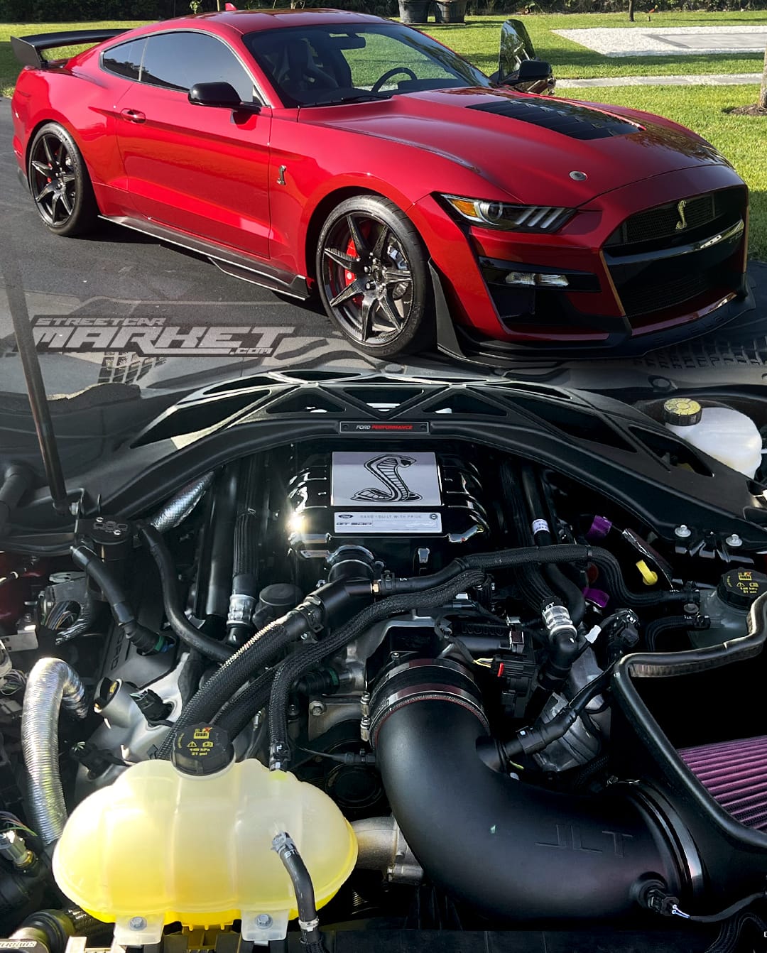 992whp 2022 Ford Mustang Shelby GT500 CFTP in Rapid Red with 2,380 miles for sale! The owner purchased the car new in NC, trailered it down to Naples, and later installed Palm Beach Dyno's 900 S3 Package. Power is sourced from a 5.2L Predator V8 that’s topped with a Jokerz ported supercharger, and linked to a Tremec TR-9070 7-speed dual-clutch transmission. In terms of fuel upgrades, this setup utilizes a set of Injector Dynamics ID1300 fuel injectors along with a Division X billet high flow fuel rails/fuel line kit. Cooling upgrades include a Whipple intercooler, Whipple high flow coolant manifold, Livernois heat exchanger, and an SPE thermostat. Further equipped with a pair of Stainless Works 2” long tube headers with upgraded JESI cats, JLT oil separator, LMP billet supercharger lid, and a Kong 105mm throttle body. Modifications were installed by the owner who has experience with building several vehicles, and tuning was completed by Ken Bjonnes at Palm Beach Dyno with an output of 879whp on 93 and 992whp on pump E85. The eye-catching Rapid Red paint looks absolutely incredible as it was ceramic coated (including the wheels/calipers), and topped with Paint Protection Film (PPF) as well. The car has also been garaged since new, it's in like new condition. Only 1,300 miles on the modifications! Receipts are available! Clean title!